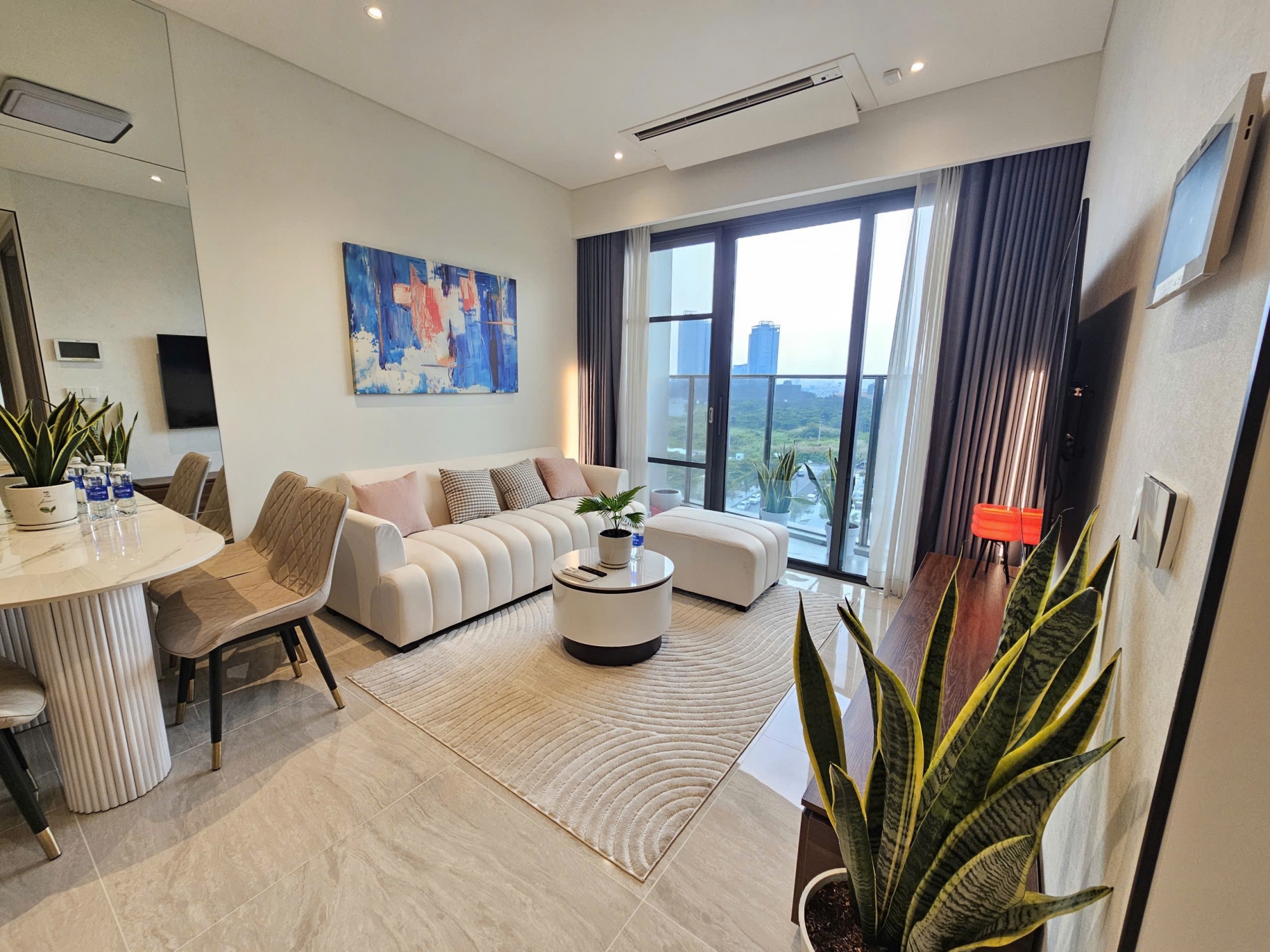 Căn hộ sở hữu không gian phòng khách rộng rãi với phong cách hiện đại, tông màu sáng chủ đạo tạo cảm giác thanh lịch và sang trọng. Sofa cao cấp, bàn trà tròn tinh tế, thảm trải sàn cùng hệ thống đèn âm trần mang đến tổng thể hài hòa và ấm cúng. Cửa kính lớn dẫn ra ban công giúp căn hộ luôn tràn ngập ánh sáng tự nhiên.