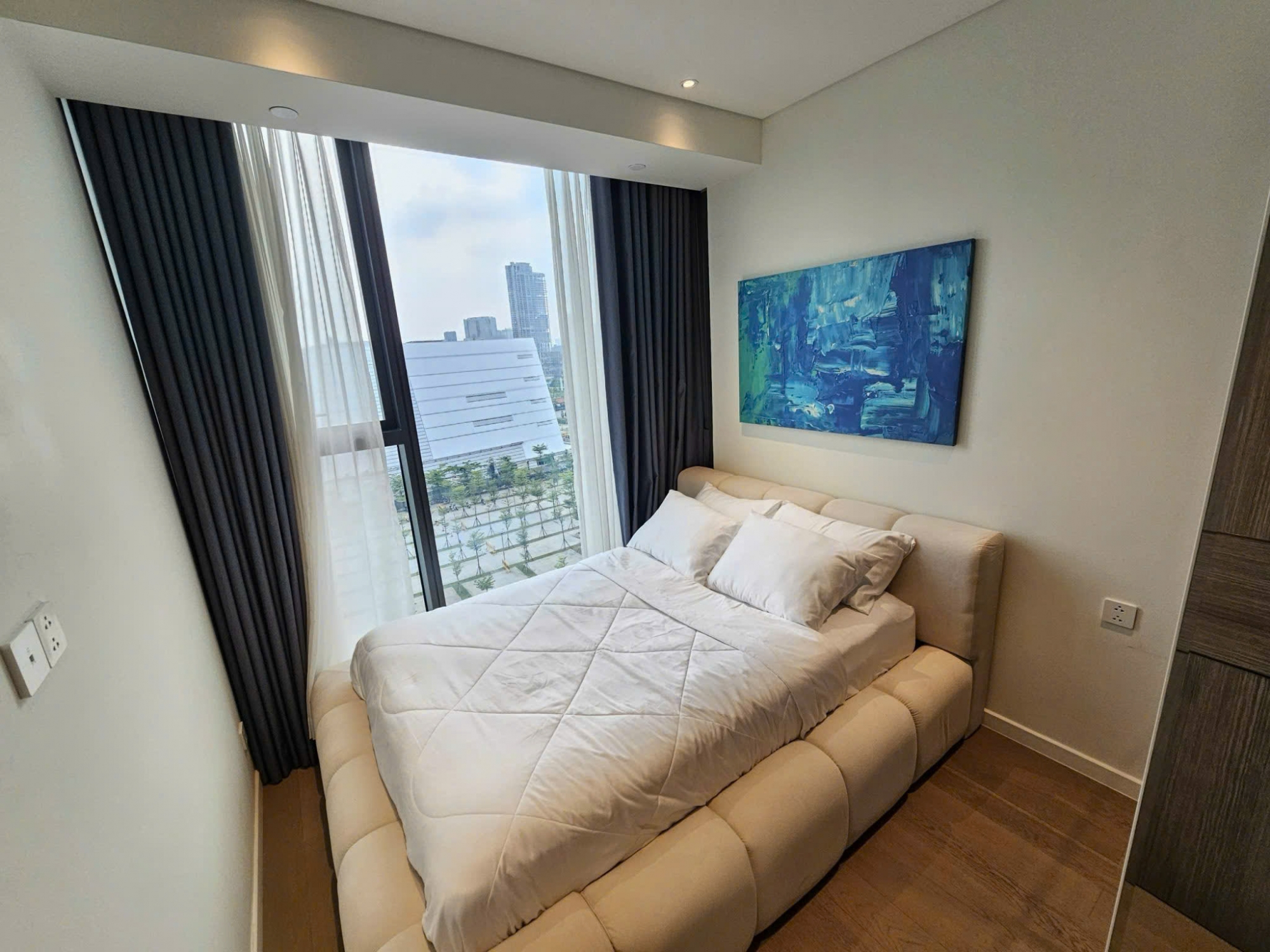 Hai phòng ngủ được bố trí riêng tư, cửa sổ lớn đón gió và ánh sáng. Nội thất được đầu tư đồng bộ, chất lượng cao, sẵn sàng vào ở ngay. Ban công view thoáng, không bị che chắn, tạo cảm giác rộng mở và thư giãn.
