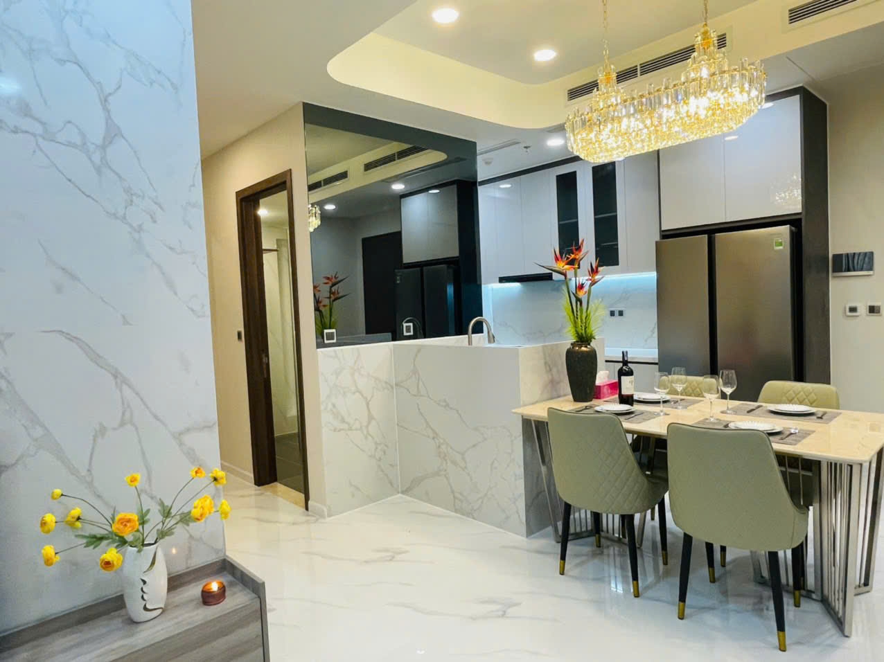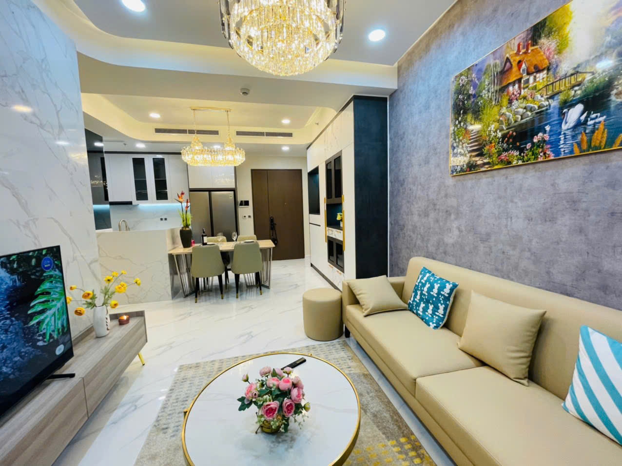 Căn hộ có diện tích 80m², bố trí 2 phòng ngủ – 2 phòng tắm, phòng khách rộng rãi kết hợp khu bếp mở, tạo cảm giác thông thoáng và liền mạch. Toàn bộ nội thất được trang bị đầy đủ và đồng bộ, từ sofa, bàn ăn, giường tủ, máy lạnh, tivi đến các thiết bị bếp, khách mua có thể vào ở ngay mà không cần đầu tư thêm.