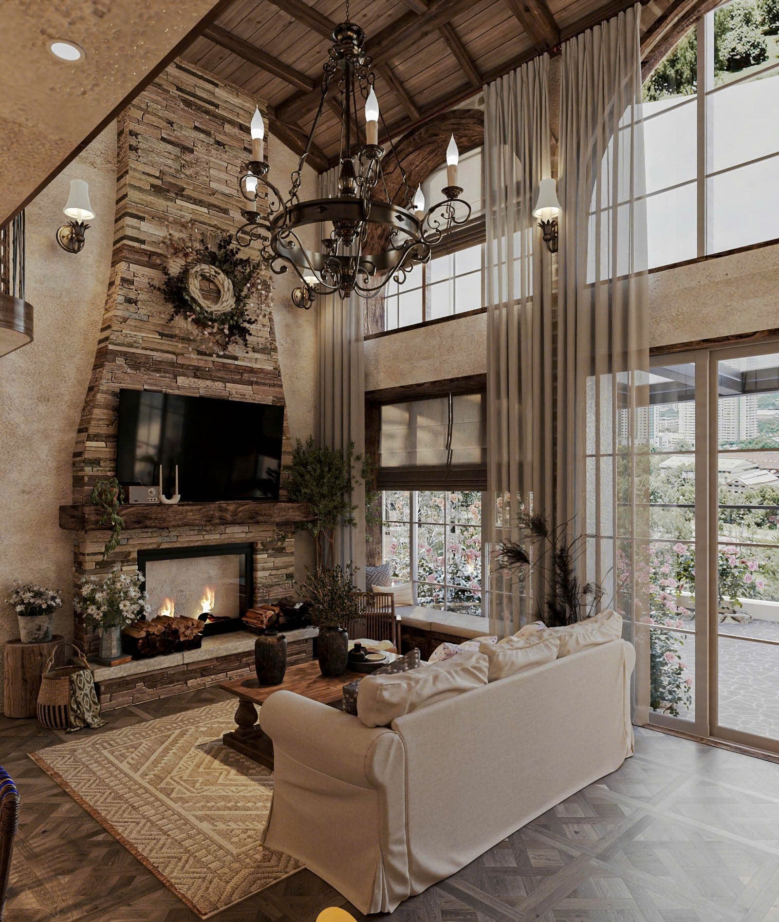 Không gian được thiết kế theo phong cách thông tầng ấn tượng, trần cao tạo chiều sâu và độ thoáng vượt trội. Phòng khách rộng lớn kết hợp cùng khu vực bàn ăn sang trọng, nổi bật với cầu thang uốn cong mềm mại như một chi tiết kiến trúc nghệ thuật. Hệ cửa kính lớn đón ánh sáng tự nhiên tối đa, mang lại cảm giác ấm áp và tinh tế cho toàn bộ căn hộ.
