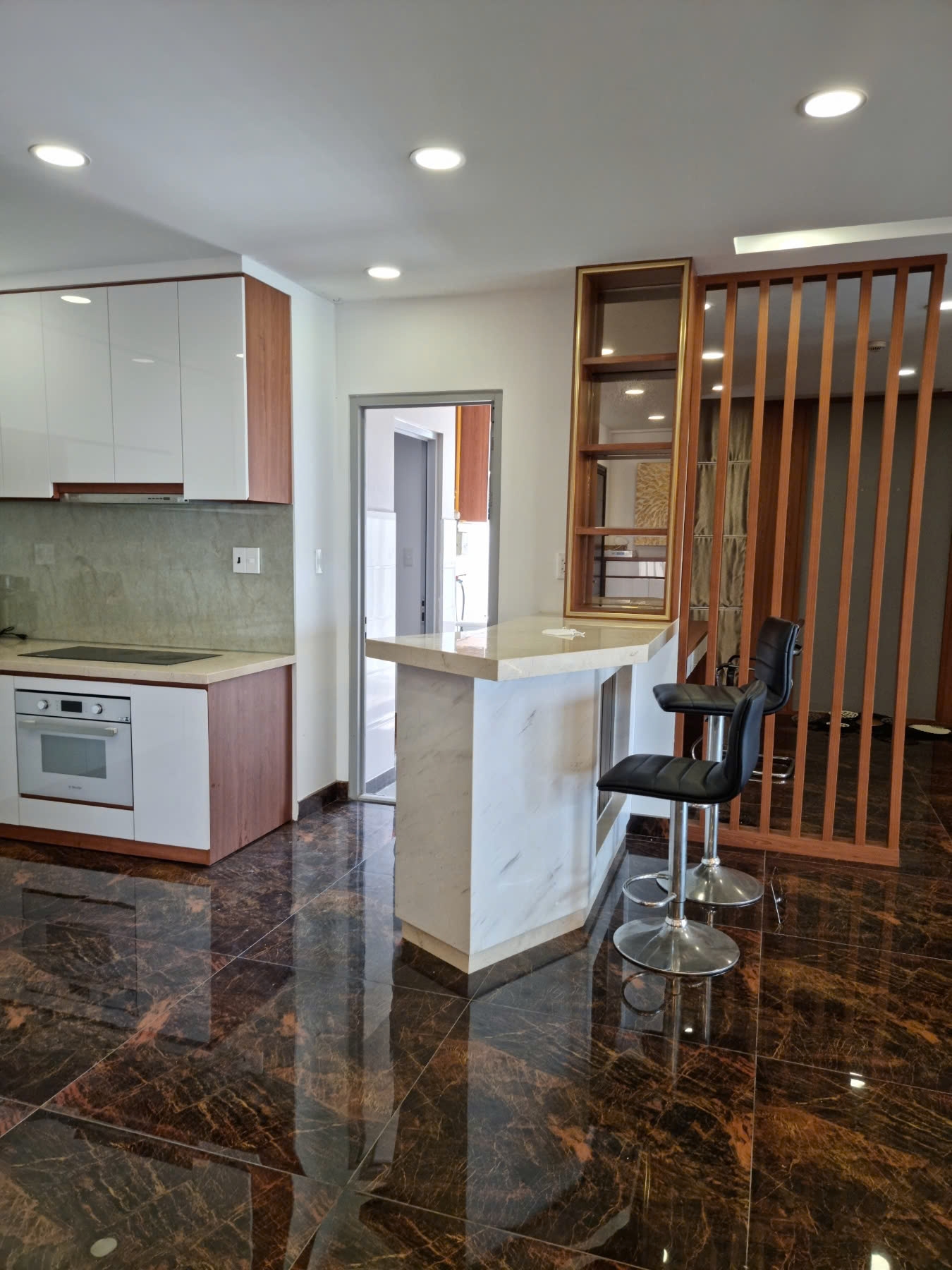 Căn hộ có diện tích 155m², bố trí gồm 2 phòng ngủ + 1 phòng làm việc, cùng 3 phòng vệ sinh tiện lợi. Không gian phòng khách rộng, kết nối khu bếp và bàn ăn tạo cảm giác thoải mái. Nhà được trang bị đầy đủ nội thất, phong cách hiện đại, chỉ cần dọn vào ở ngay.