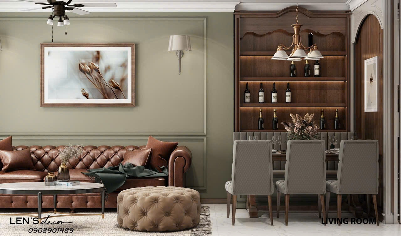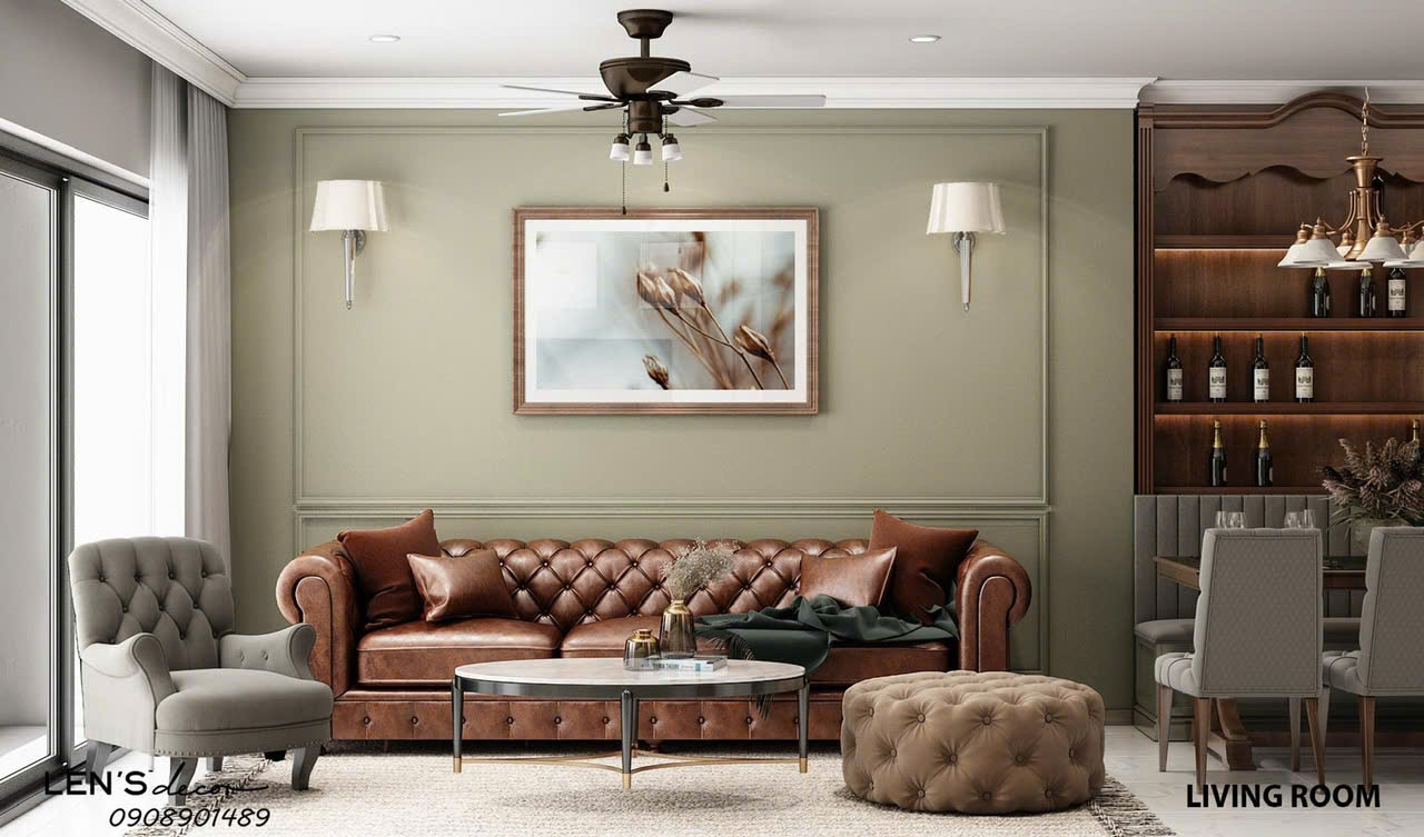 Căn hộ được thiết kế theo phong cách sang trọng, tinh tế với tông màu ấm áp và nội thất mới hoàn toàn. Phòng khách nổi bật với sofa da phong cách cổ điển, kết hợp bàn trà tròn hiện đại, tạo nên điểm nhấn ấn tượng và đẳng cấp. Không gian được bố trí hài hòa, tối ưu ánh sáng tự nhiên nhờ hệ cửa kính lớn, mang lại cảm giác thoáng đãng và dễ chịu.