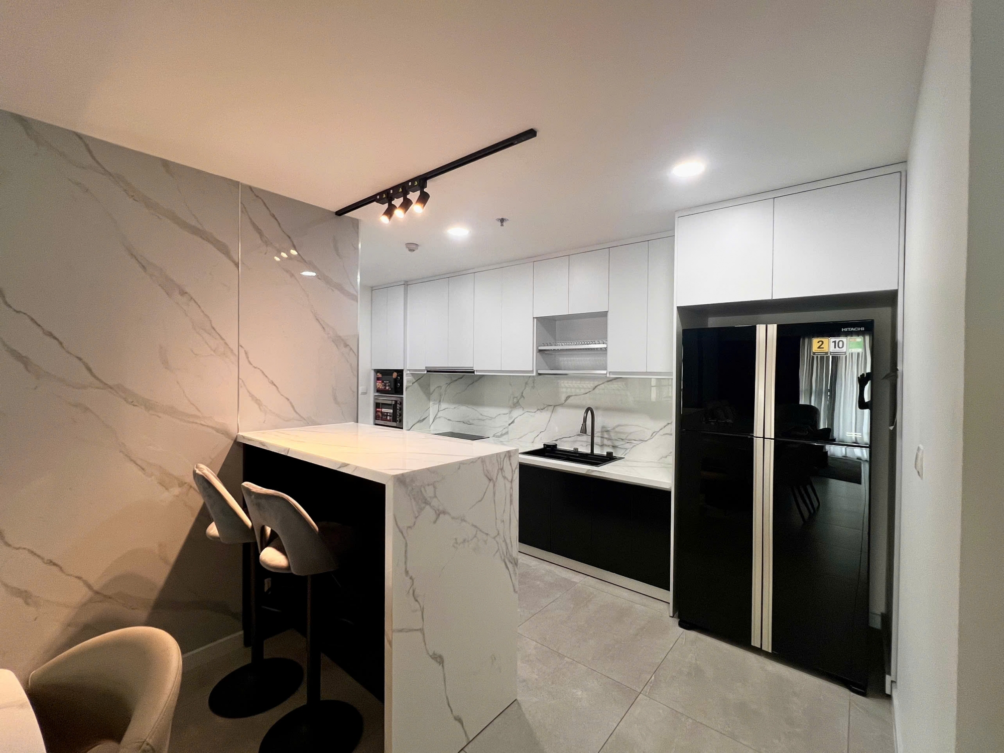 Khu bếp được thiết kế gọn gàng với quầy bar hiện đại và đầy đủ thiết bị, phù hợp cho nhu cầu sinh hoạt và tiếp khách. Ba phòng ngủ được bố trí hợp lý, mang lại không gian riêng tư và thoải mái cho từng thành viên trong gia đình. Hai phòng tắm (2WC) được trang bị tiện nghi hiện đại.