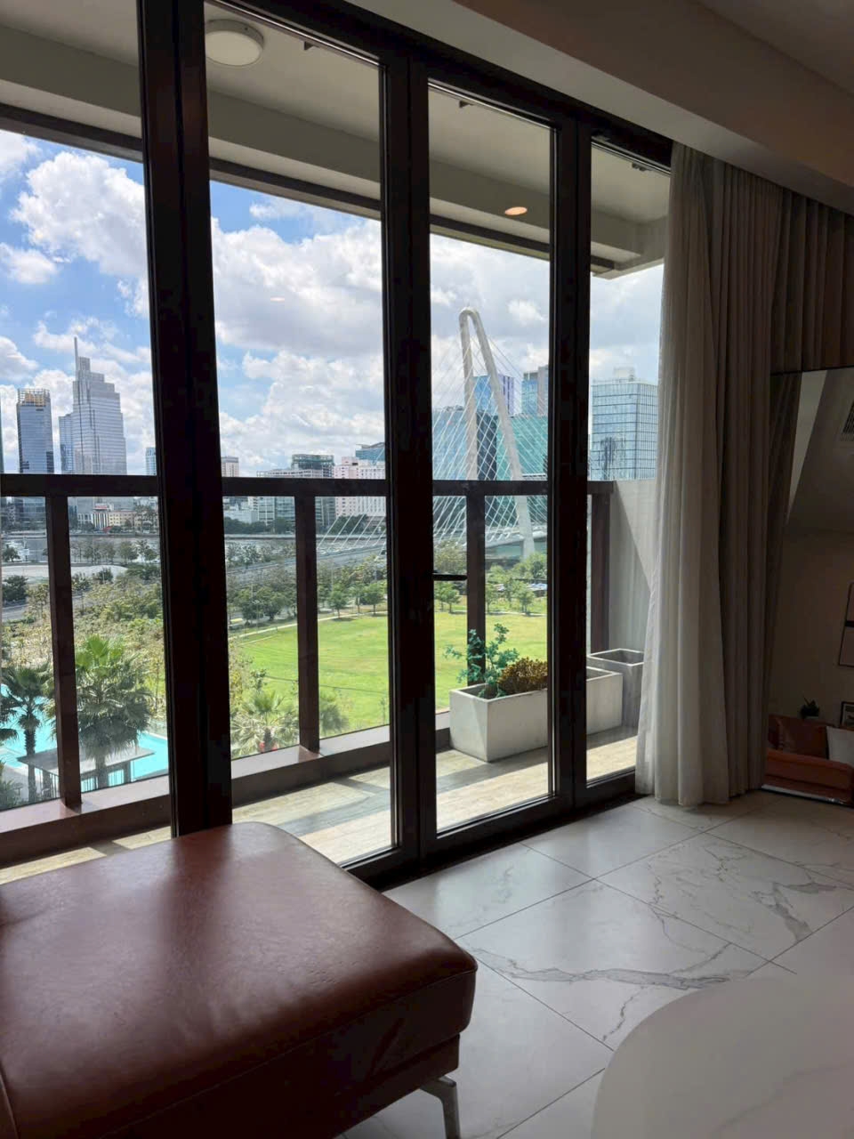 Với lợi thế view trực diện sông Sài Gòn, nhìn thẳng về Quận 1 và cầu Ba Son, căn hộ mang đến trải nghiệm sống khác biệt. Từ phòng khách và ban công, gia chủ có thể chiêm ngưỡng toàn cảnh skyline rực rỡ về đêm và khung cảnh sông nước thoáng đãng vào ban ngày.