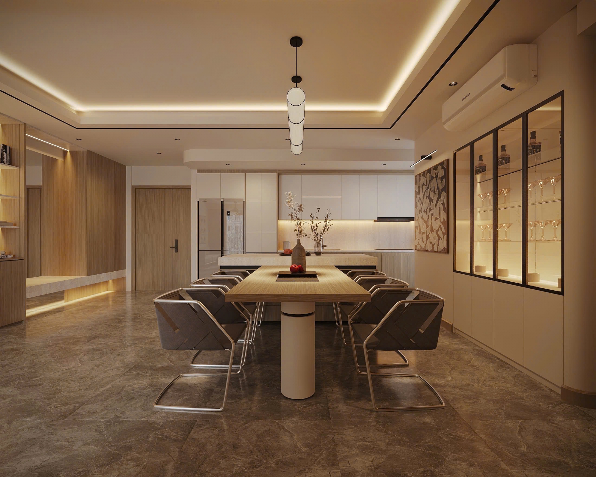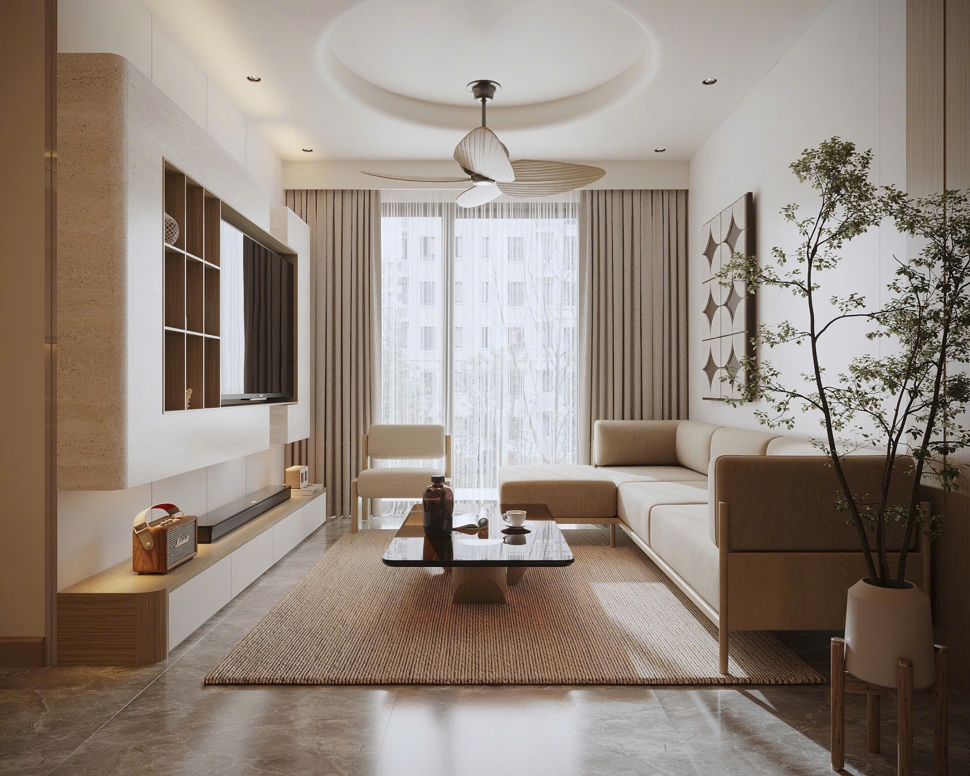 Không gian nội thất được đầu tư hoàn toàn mới, sử dụng vật liệu cao cấp, gam màu trung tính thanh lịch, tạo cảm giác ấm cúng nhưng vẫn rất sang trọng. Phòng khách rộng rãi, kết nối hài hòa với khu vực bếp và bàn ăn, mang đến sự thông thoáng và tiện nghi trong sinh hoạt hằng ngày. Hệ cửa kính lớn giúp căn hộ luôn tràn ngập ánh sáng tự nhiên.
