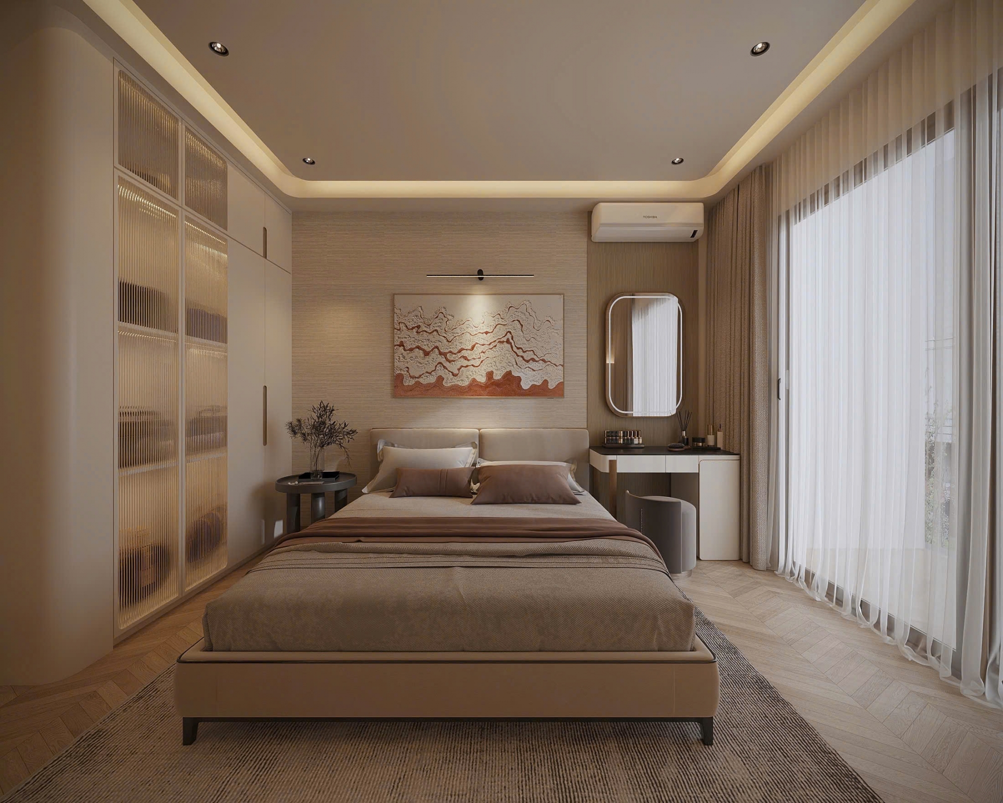 Căn hộ gồm 3 phòng ngủ riêng biệt, trong đó phòng ngủ master rộng rãi với nhà vệ sinh khép kín. Các phòng đều được trang bị đầy đủ giường, tủ, máy lạnh và rèm cửa cao cấp. Khu bếp hiện đại với đầy đủ thiết bị điện tử, phù hợp cho khách thuê ở lâu dài.