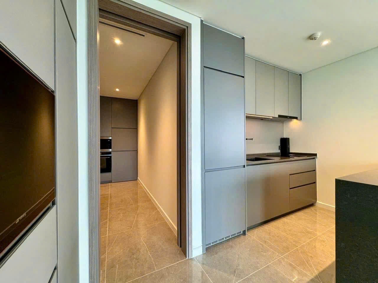 Căn hộ bàn giao nội thất cơ bản, phù hợp cho khách thuê mong muốn tự thiết kế theo phong cách riêng. Không gian phòng khách rộng với sàn đá bóng cao cấp, trần cao và tường sáng màu giúp tổng thể thêm phần sang trọng và thoáng đãng.