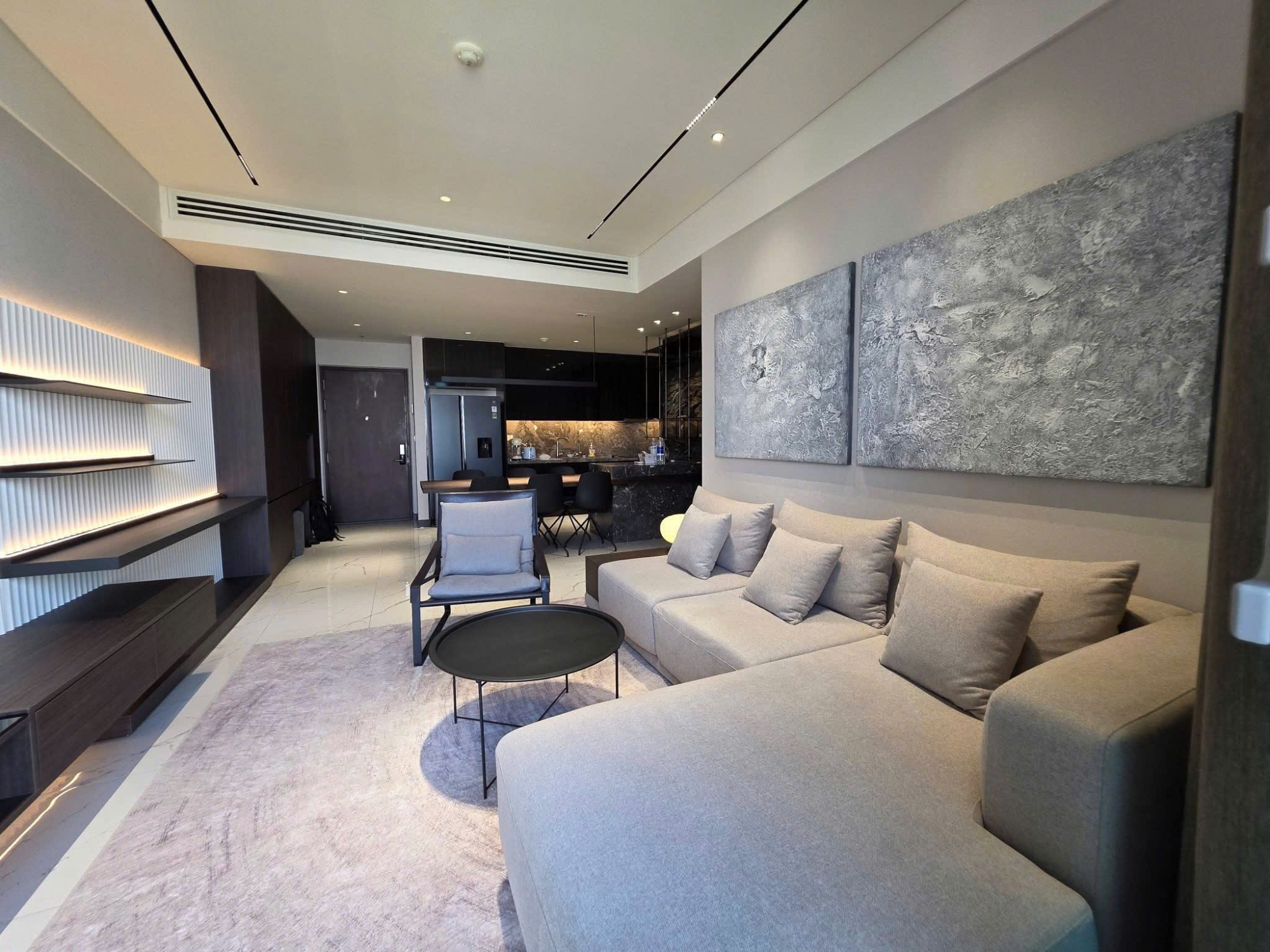 Căn hộ được thiết kế theo phong cách hiện đại với không gian rộng rãi và nhiều ánh sáng tự nhiên. Nội thất được trang bị đầy đủ với chất lượng cao cấp và bố trí hài hòa, mang đến cảm giác sang trọng nhưng vẫn ấm cúng. Phòng khách rộng rãi được thiết kế tinh tế với sofa lớn, kệ tivi hiện đại và hệ thống đèn trang trí tạo nên không gian sinh hoạt thoải mái.