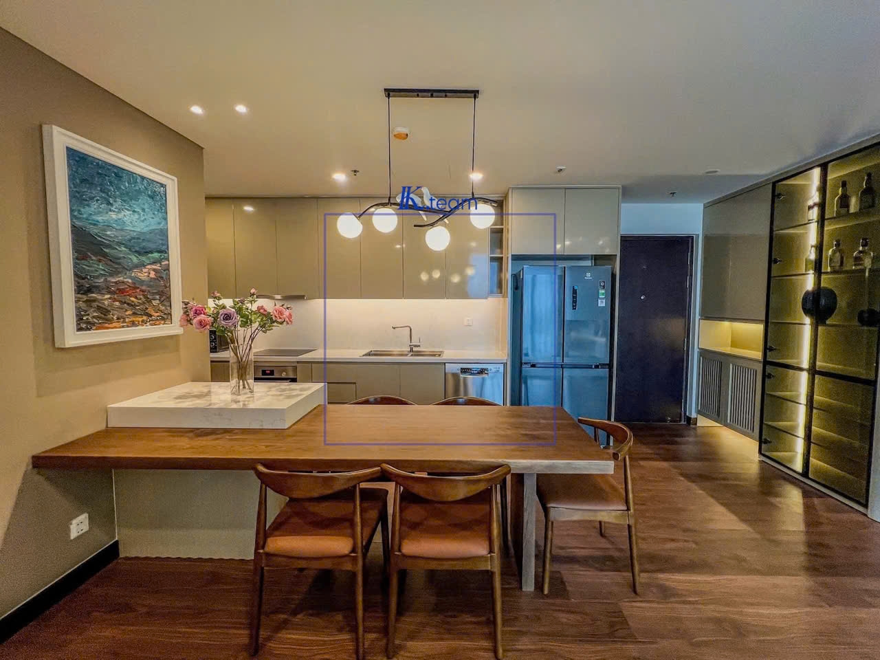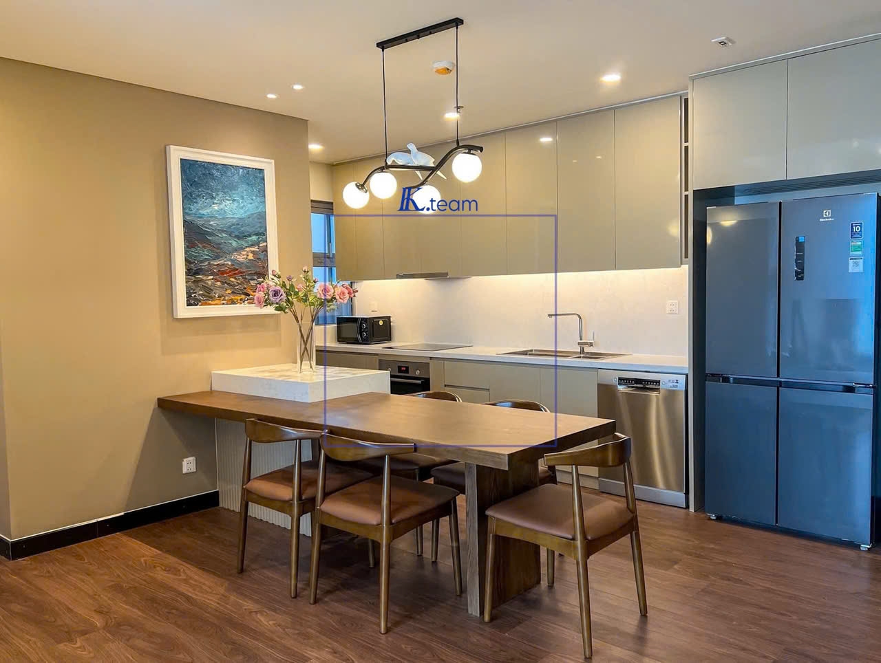 Toàn bộ căn hộ được trang bị đầy đủ nội thất cao cấp, thiết kế đồng bộ, gam màu ấm sang trọng. Khu bếp hiện đại với đầy đủ thiết bị; phòng ngủ yên tĩnh, ấm cúng, phù hợp cho gia đình trẻ, chuyên gia hoặc khách nước ngoài sinh sống lâu dài.