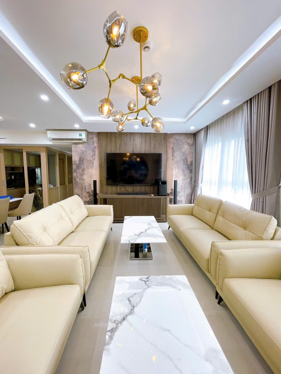 Căn hộ nổi bật với phòng khách rộng rãi, bố trí bộ sofa da cao cấp tông màu kem sang trọng, kết hợp bàn trà mặt đá và hệ thống đèn chùm thiết kế hiện đại tạo điểm nhấn ấn tượng. Không gian mở liên thông giữa phòng khách và khu vực bàn ăn giúp tổng thể căn hộ trở nên thoáng đãng và tiện nghi, rất phù hợp cho gia đình hoặc khách thuê yêu thích tiếp khách tại nhà.