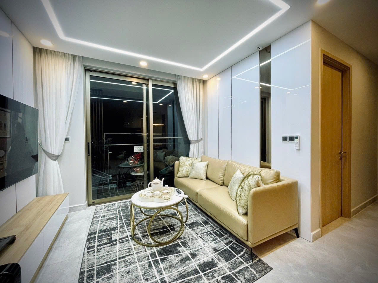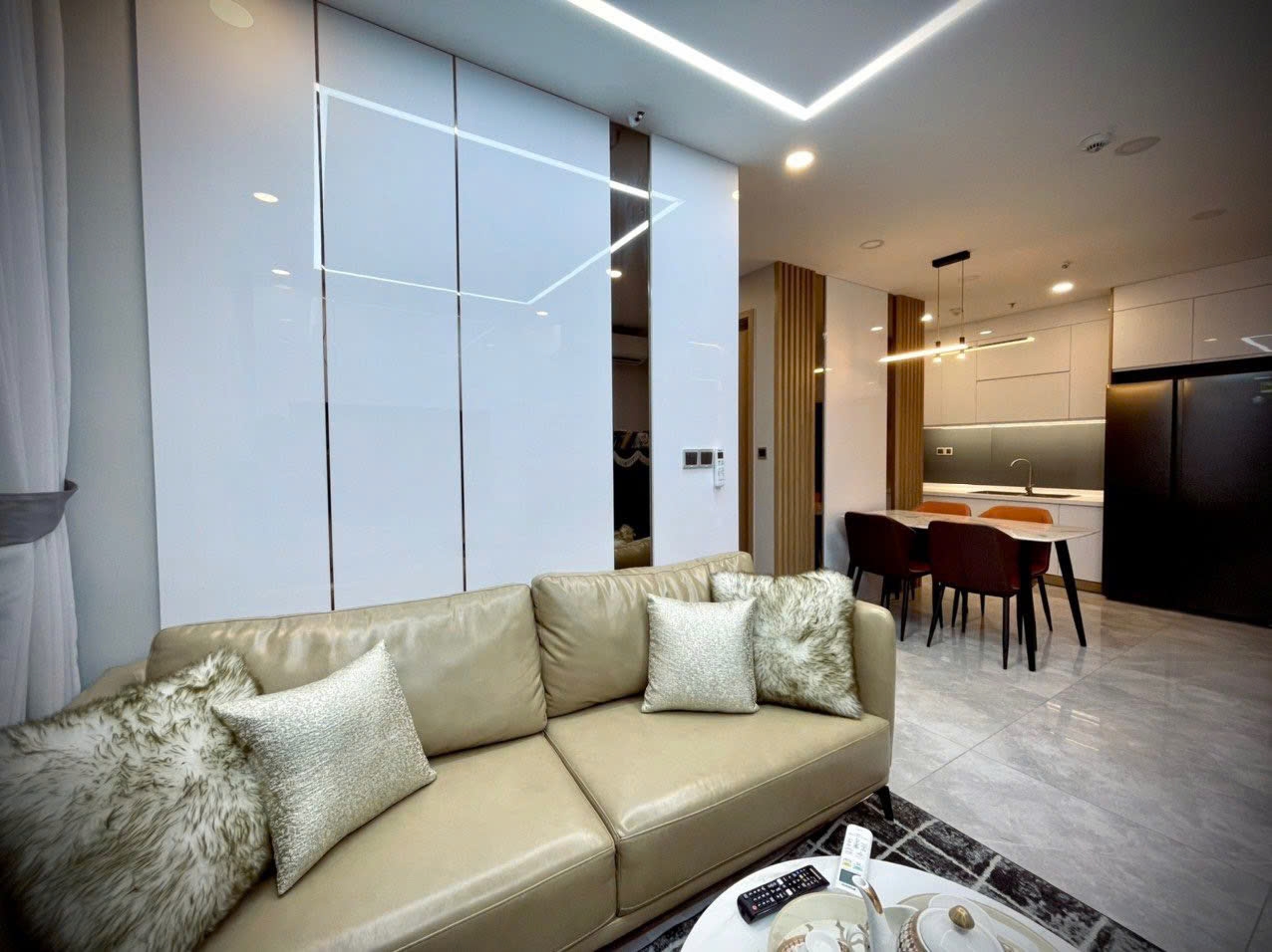 Căn hộ được trang bị đầy đủ nội thất sang trọng, lựa chọn kỹ lưỡng từ sofa, bàn ăn, giường ngủ đến hệ tủ và thiết bị bếp. Phong cách thiết kế tinh tế, gam màu ấm, phù hợp cho khách ở lâu dài, chuyên gia nước ngoài hoặc gia đình trẻ.