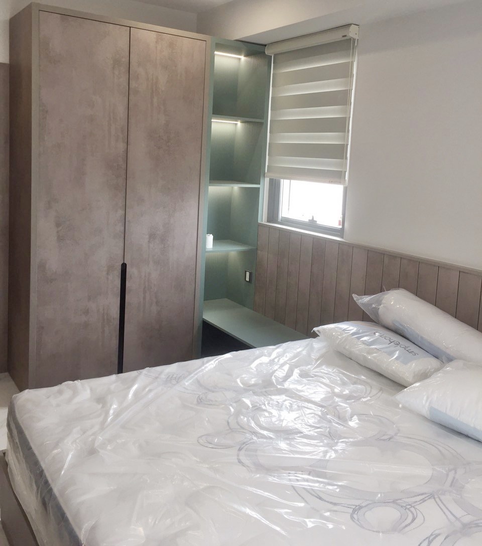 The kitchen comes fully equipped with upper and lower cabinets, induction cooktop, range hood, refrigerator, and essential appliances for daily living. Both bedrooms include beds, mattresses, wardrobes, and separate air conditioners, ensuring privacy and comfort. The bathroom is fitted with quality sanitary equipment, clean and practical.