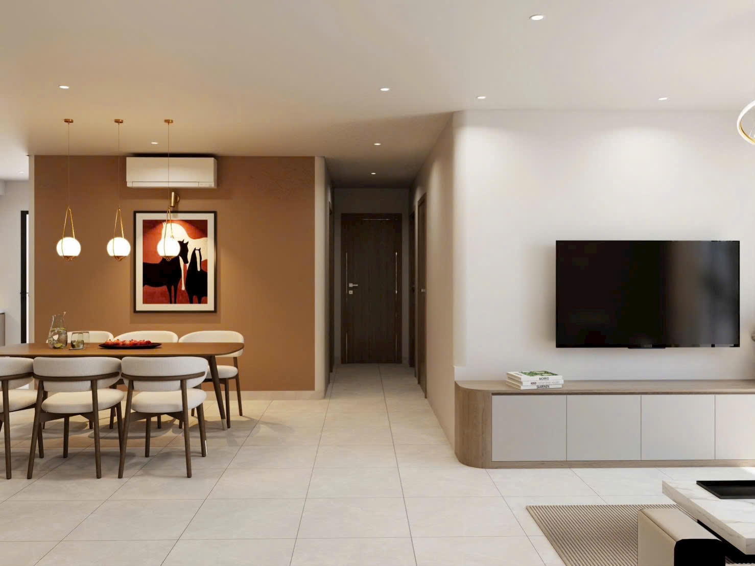The apartment features a minimalist modern design with bright tones and clean lines, creating a calm and elegant living space. The living room is spacious and connected to a balcony, allowing natural light and fresh air to flow throughout the home.