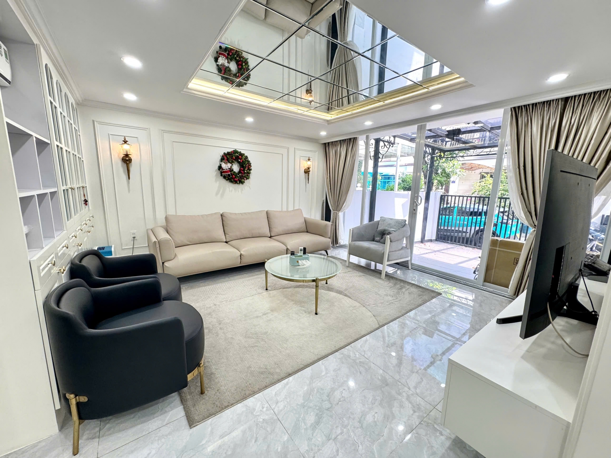 The villa features 4 spacious bedrooms, thoughtfully designed to provide comfort and privacy. The living room is bright and airy with a high ceiling, tasteful color tones, and premium furniture, creating a warm yet refined atmosphere. Large glass doors allow plenty of natural light and connect seamlessly with the outdoor space.