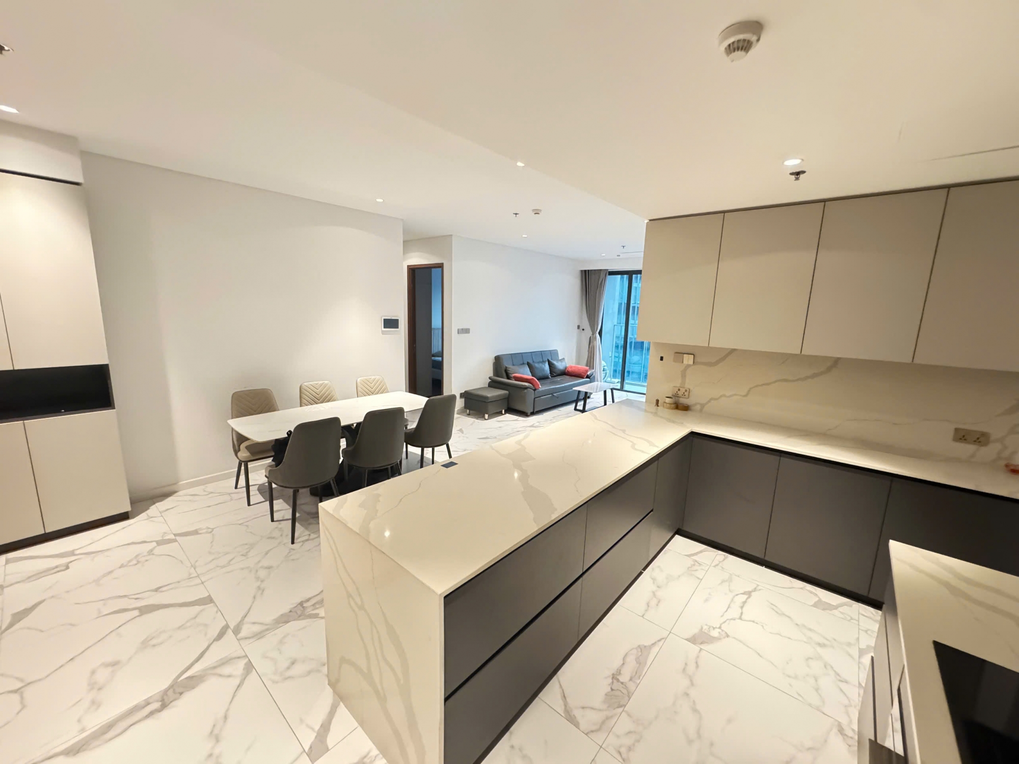With a generous area of 115 sqm, the apartment features a modern open-plan layout connecting the living room, dining area, and kitchen, creating a bright and airy living environment. The unit comes fully furnished, designed in a refined minimalist style with neutral tones, premium marble flooring, and sleek built-in cabinetry.