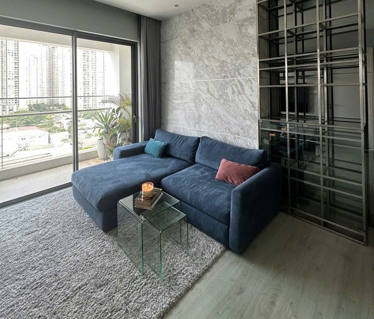 This apartment in Gateway Thao Dien features a modern layout with a bright and airy living space The living room connects to a balcony allowing natural light and ventilation