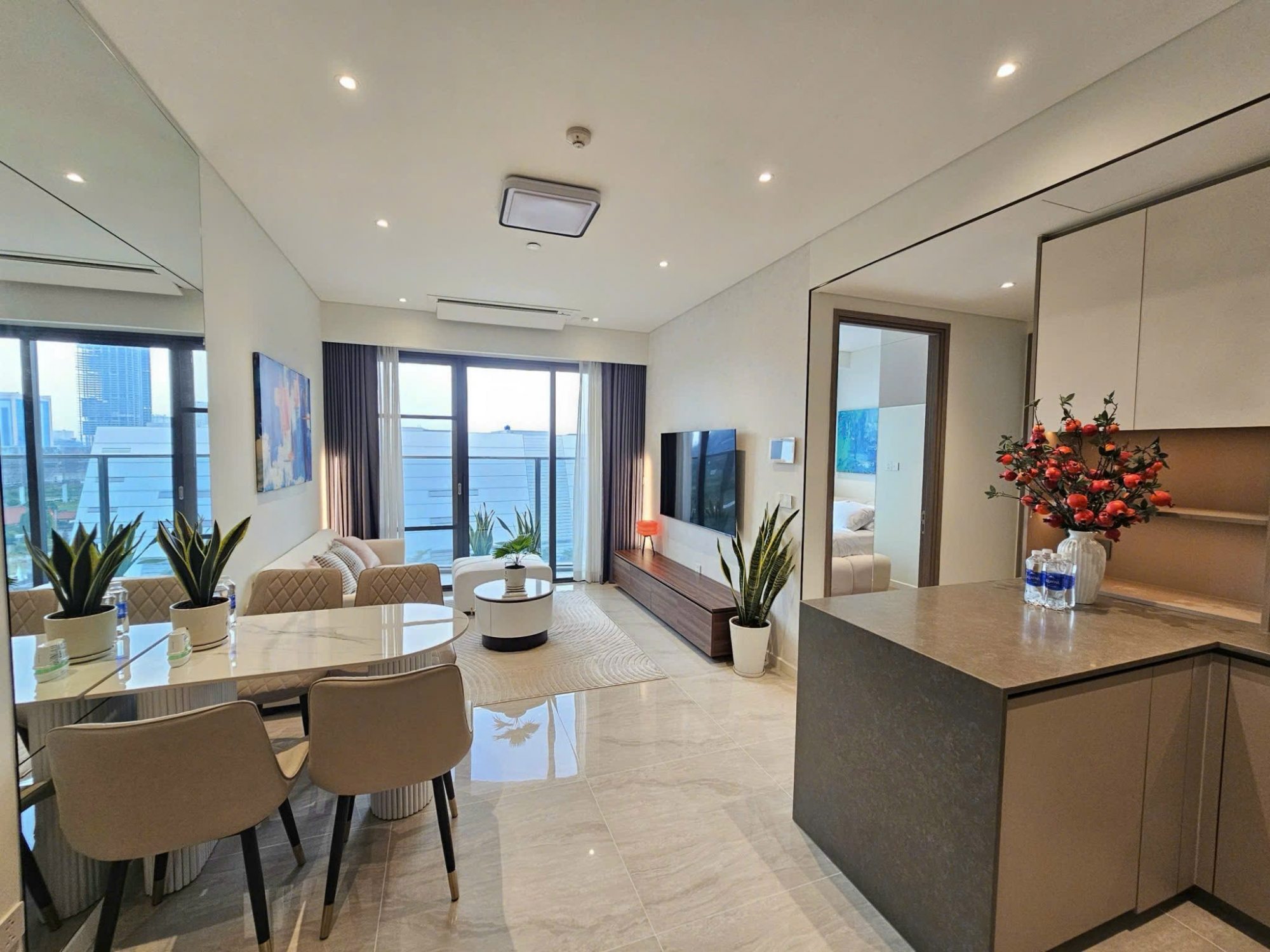 Căn hộ sở hữu không gian phòng khách rộng rãi với phong cách hiện đại, tông màu sáng chủ đạo tạo cảm giác thanh lịch và sang trọng. Sofa cao cấp, bàn trà tròn tinh tế, thảm trải sàn cùng hệ thống đèn âm trần mang đến tổng thể hài hòa và ấm cúng. Cửa kính lớn dẫn ra ban công giúp căn hộ luôn tràn ngập ánh sáng tự nhiên.