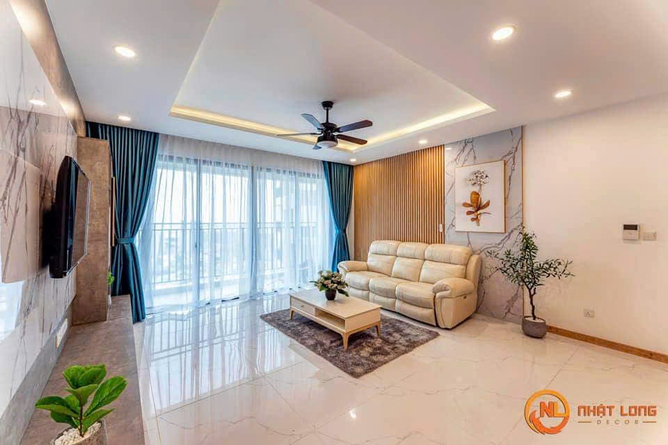 Căn hộ có diện tích 125m², được bố trí 3 phòng ngủ và 2 phòng tắm, thiết kế khoa học giúp tận dụng tối đa diện tích sử dụng. Không gian phòng khách rộng rãi, kết nối hài hòa với khu vực bếp và bàn ăn, tạo nên tổng thể sinh hoạt chung ấm cúng và tiện lợi cho gia đình.Phòng khách được trang bị bộ sofa lớn sang trọng, bàn trà hiện đại cùng hệ thống đèn chiếu sáng và trang trí tinh tế. Thiết kế trần cao kết hợp với hệ cửa sổ lớn giúp căn hộ luôn tràn ngập ánh sáng tự nhiên, mang lại cảm giác thoáng đãng và dễ chịu.