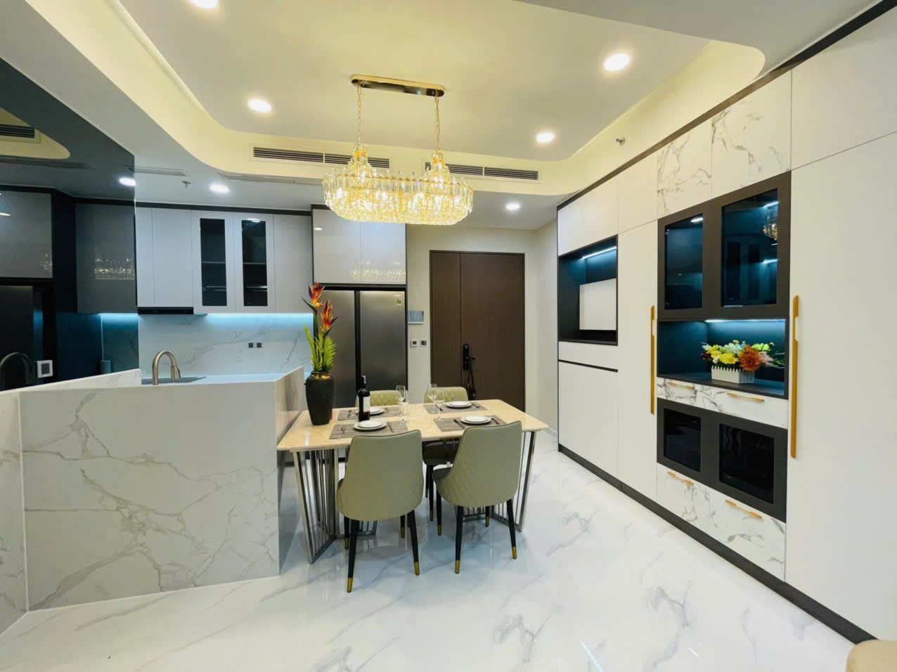 Căn hộ có diện tích 80m², bố trí 2 phòng ngủ – 2 phòng tắm, phòng khách rộng rãi kết hợp khu bếp mở, tạo cảm giác thông thoáng và liền mạch. Toàn bộ nội thất được trang bị đầy đủ và đồng bộ, từ sofa, bàn ăn, giường tủ, máy lạnh, tivi đến các thiết bị bếp, khách mua có thể vào ở ngay mà không cần đầu tư thêm.