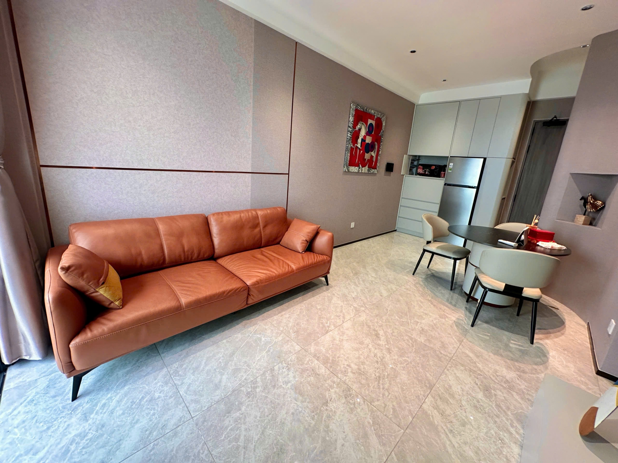 Căn hộ có diện tích 52m², được bố trí hợp lý với phòng khách kết nối trực tiếp với khu vực bàn ăn và bếp, tạo nên không gian sinh hoạt thoáng đãng và tiện lợi. Tông màu trung tính kết hợp cùng nội thất hiện đại mang lại cảm giác sang trọng nhưng vẫn ấm cúng.