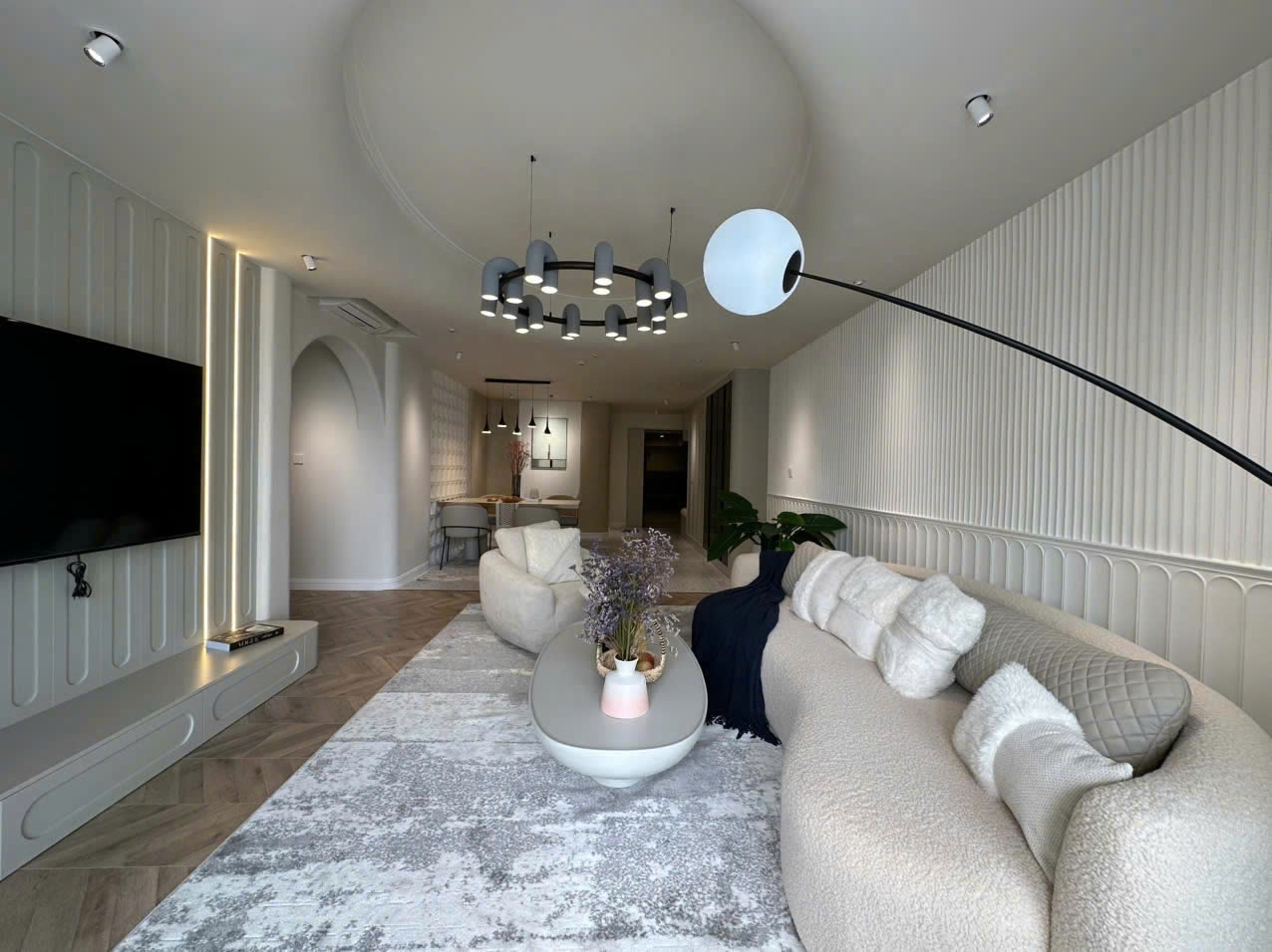 The unit is designed in a modern and sophisticated style, featuring neutral tones that enhance brightness and create a refined atmosphere. The large living room is seamlessly connected to the dining area and fully equipped kitchen, providing an open and welcoming space for everyday living and entertaining.