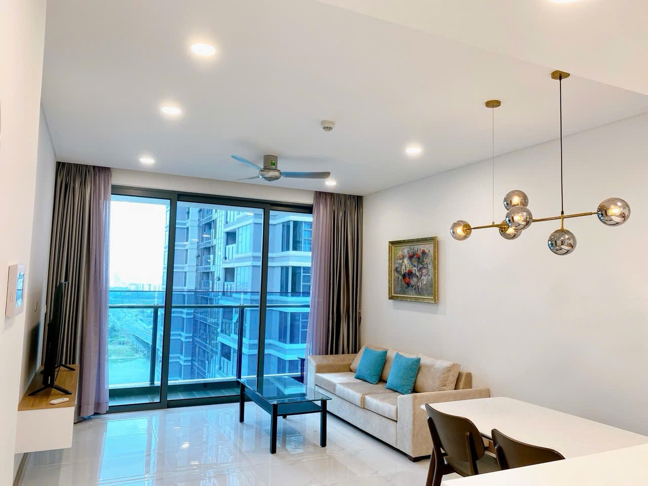 Không gian căn hộ được thiết kế theo phong cách hiện đại, đề cao sự tinh gọn và tính thực tế. Phòng khách bố trí sofa sáng màu kết hợp bàn trà kính đơn giản, tạo nên tổng thể thanh lịch và dễ chịu. Từ khu vực này có thể tiếp cận ban công, nơi đón gió sông tự nhiên và ánh sáng chan hòa, giúp căn nhà luôn thông thoáng.