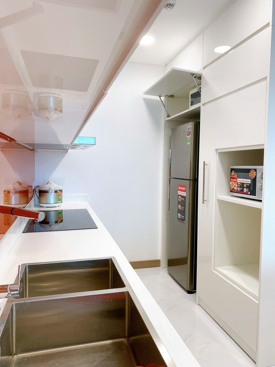 Bếp và khu vực ăn uống được sắp xếp liền mạch, tối ưu diện tích nhưng vẫn đảm bảo sự thoải mái khi sử dụng. Hệ tủ bếp âm tường cùng các thiết bị cần thiết đã được lắp đặt đầy đủ, phù hợp cho nhu cầu sinh hoạt hằng ngày.