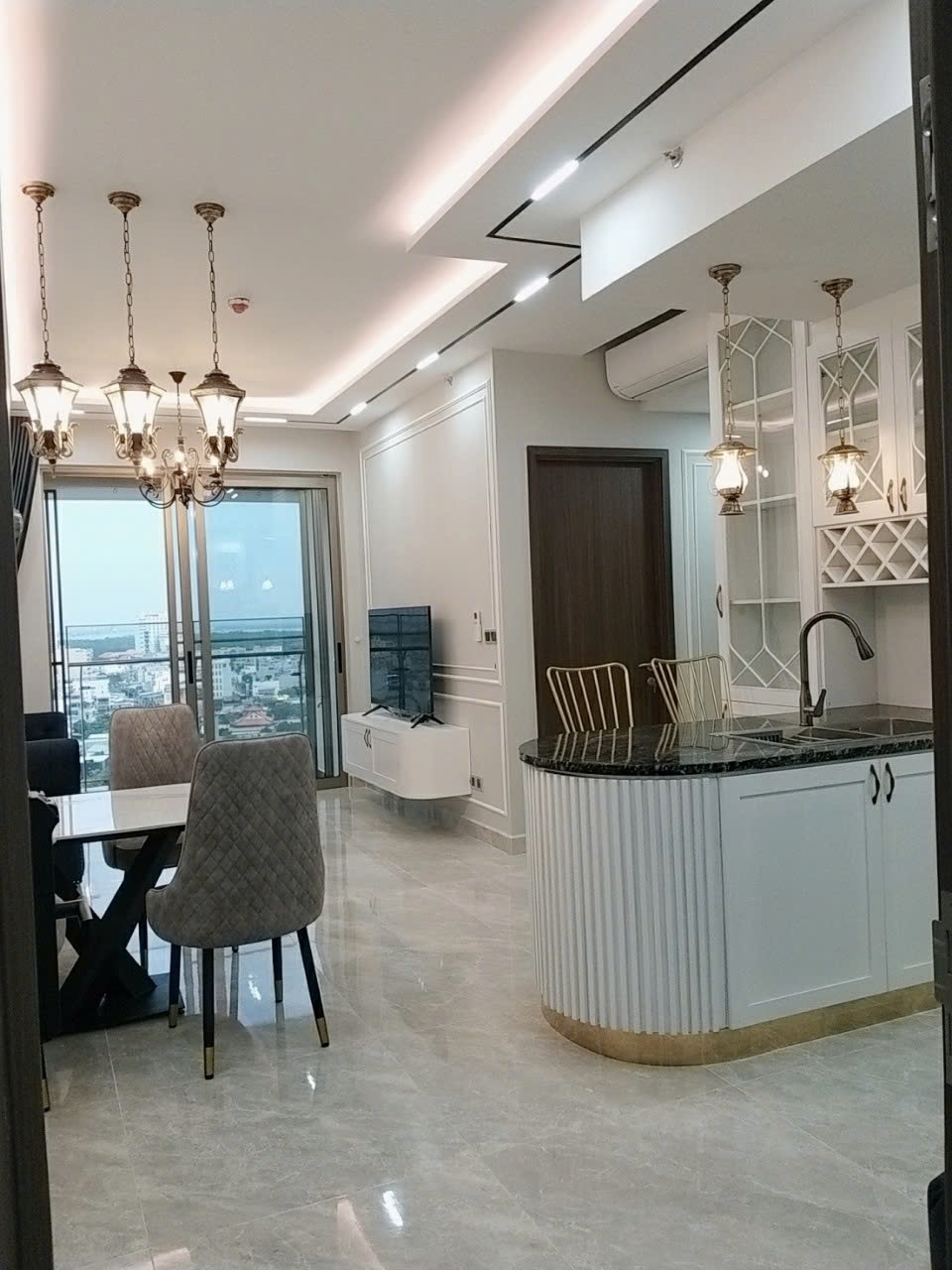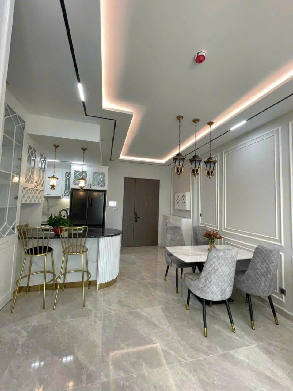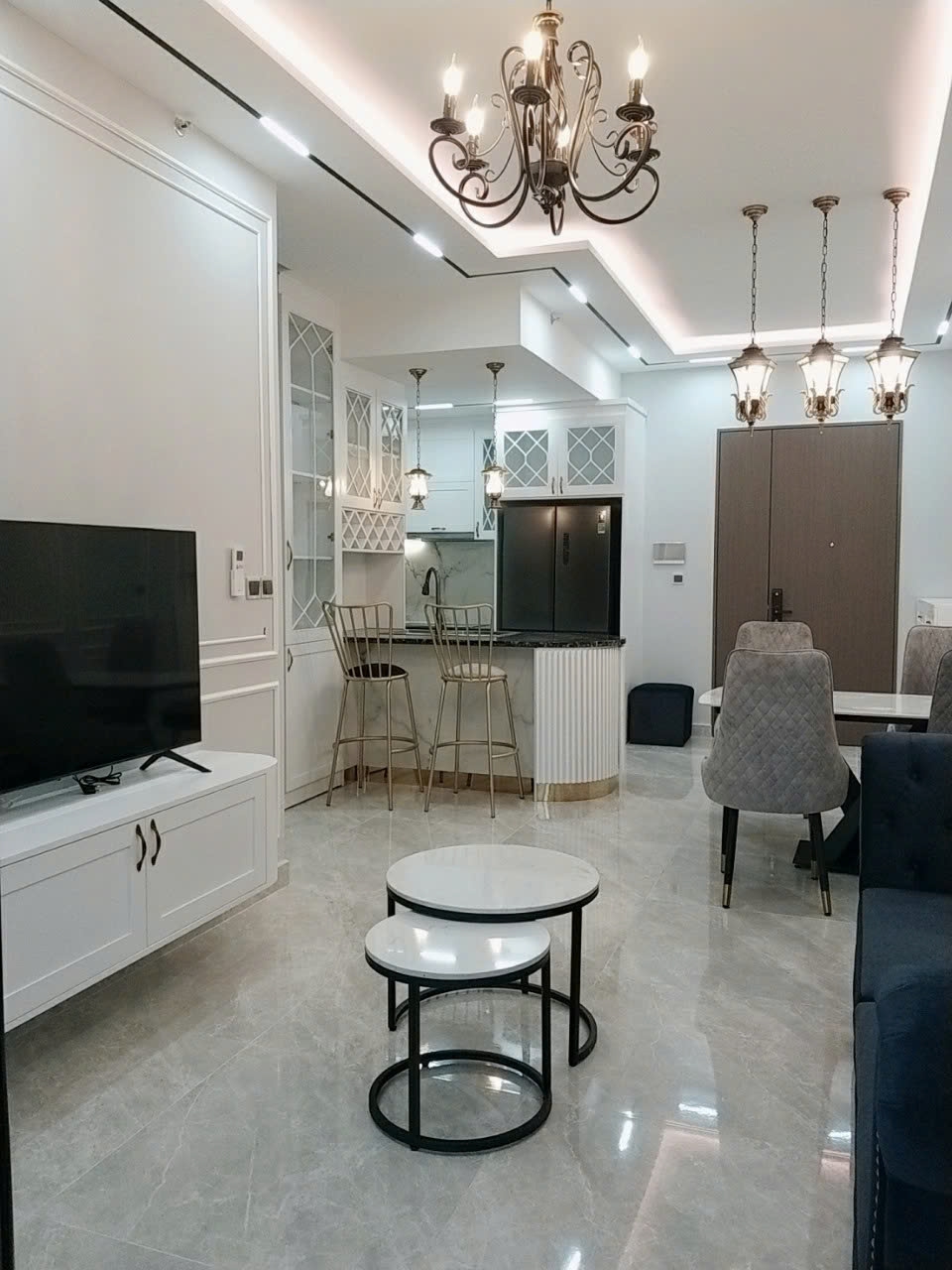 Căn hộ được hoàn thiện full nội thất sang trọng theo phong cách tân hiện đại, sử dụng gam màu trang nhã, vật liệu cao cấp và ánh sáng được bố trí tinh tế. Không gian phòng khách liên thông bếp, đảo bếp bo tròn mềm mại vừa tăng công năng vừa tạo điểm nhấn thẩm mỹ cho toàn bộ căn hộ.