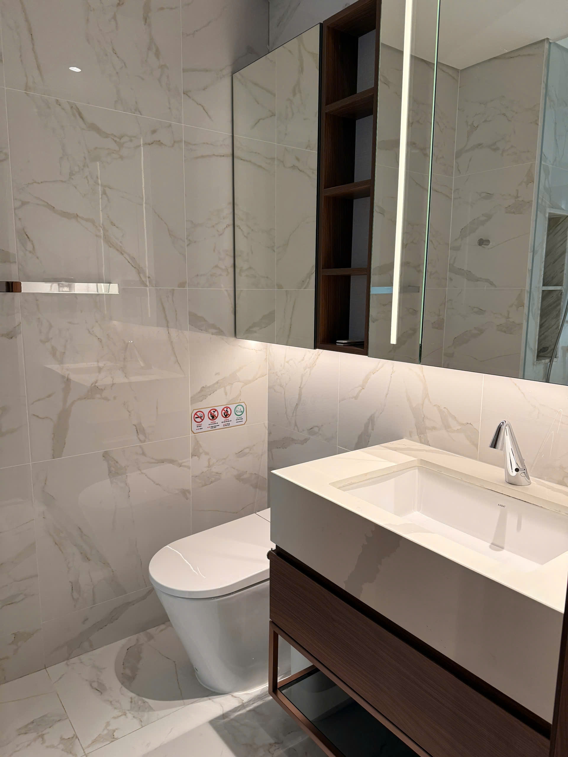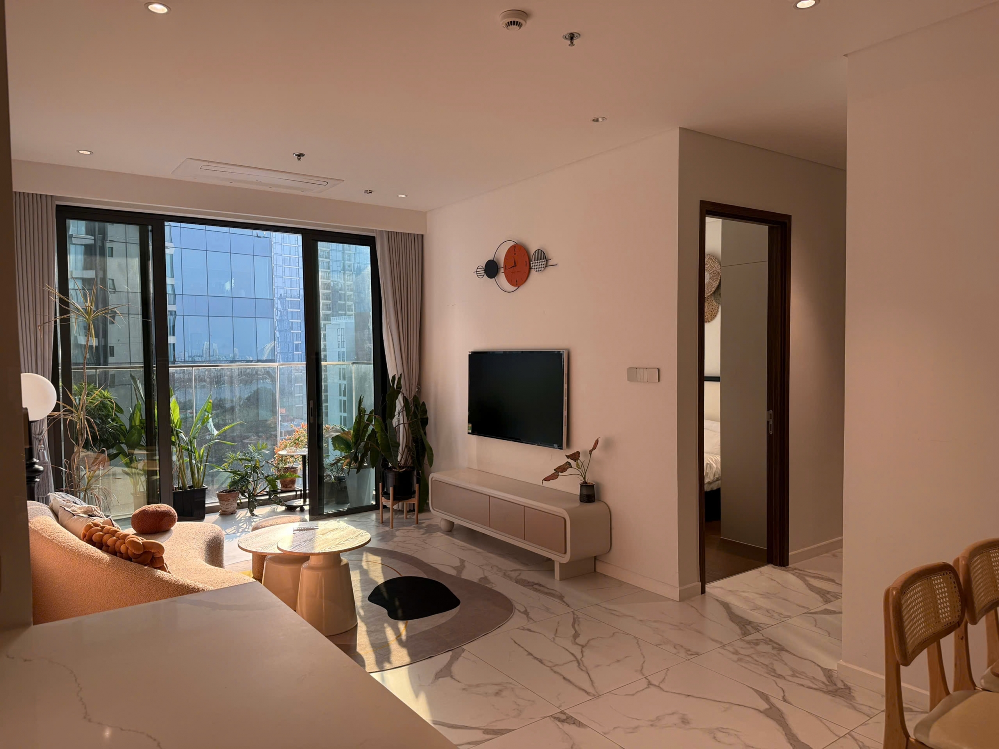 Căn hộ được thiết kế hiện đại với bố cục hợp lý gồm 2 phòng ngủ và 2 phòng vệ sinh, mang đến không gian sống tiện nghi và thoải mái cho gia đình nhỏ hoặc chuyên gia nước ngoài. Phòng khách rộng rãi, kết nối trực tiếp với ban công kính lớn, đón ánh sáng tự nhiên và gió trời, tạo cảm giác thông thoáng và dễ chịu.