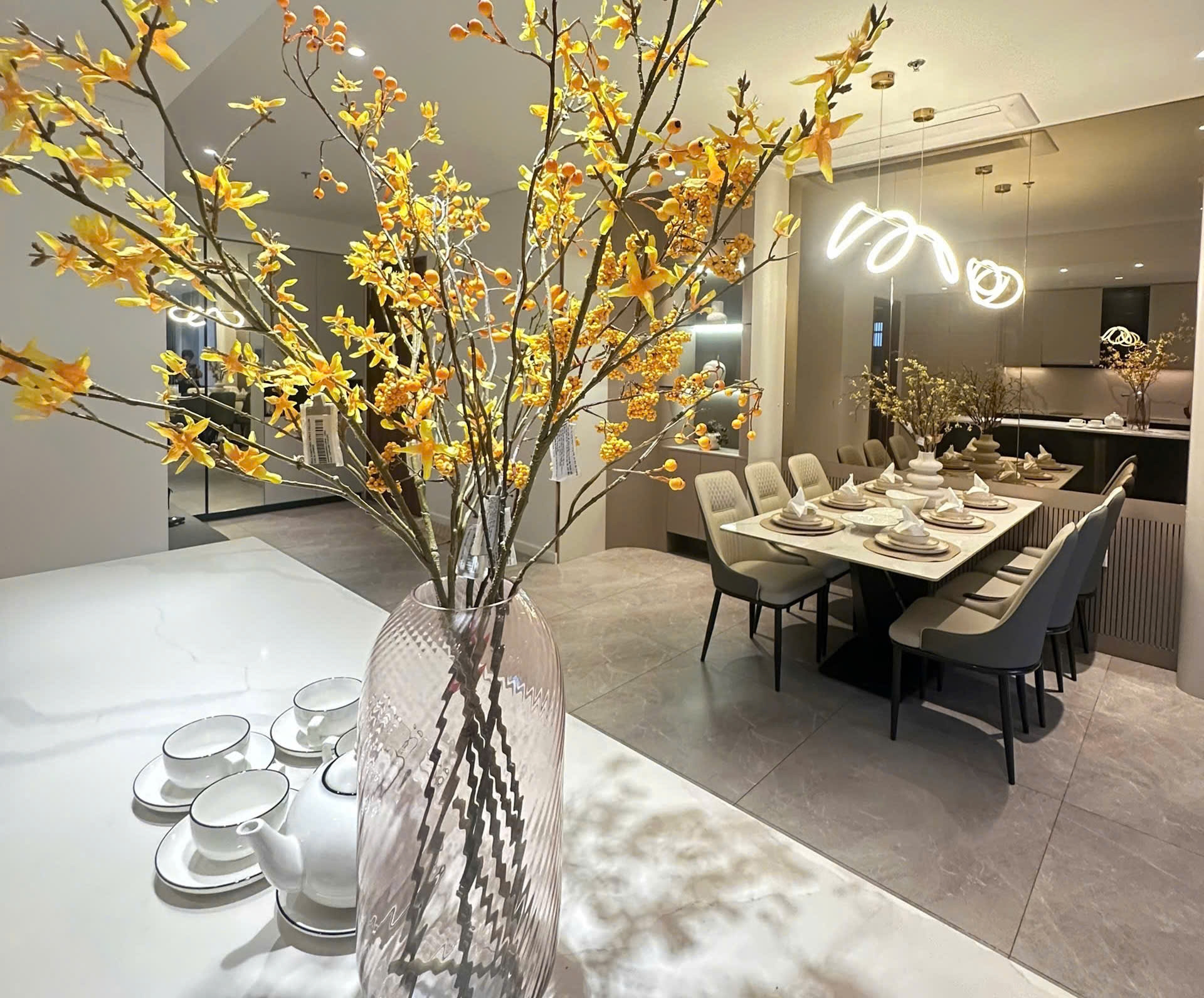 Căn hộ 3 phòng ngủ tại The Metropole – The Crest mang phong cách thiết kế hiện đại, tinh tế với không gian sống rộng rãi và sang trọng. Phòng khách được bố trí thoáng đãng, kết nối trực tiếp với khu vực bếp và bàn ăn, tạo nên một tổng thể hài hòa, lý tưởng cho sinh hoạt gia đình cũng như tiếp đón khách.