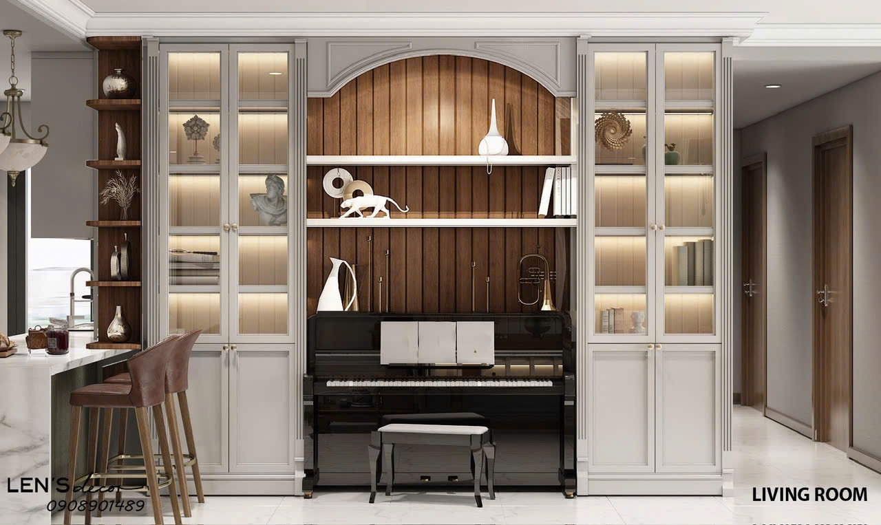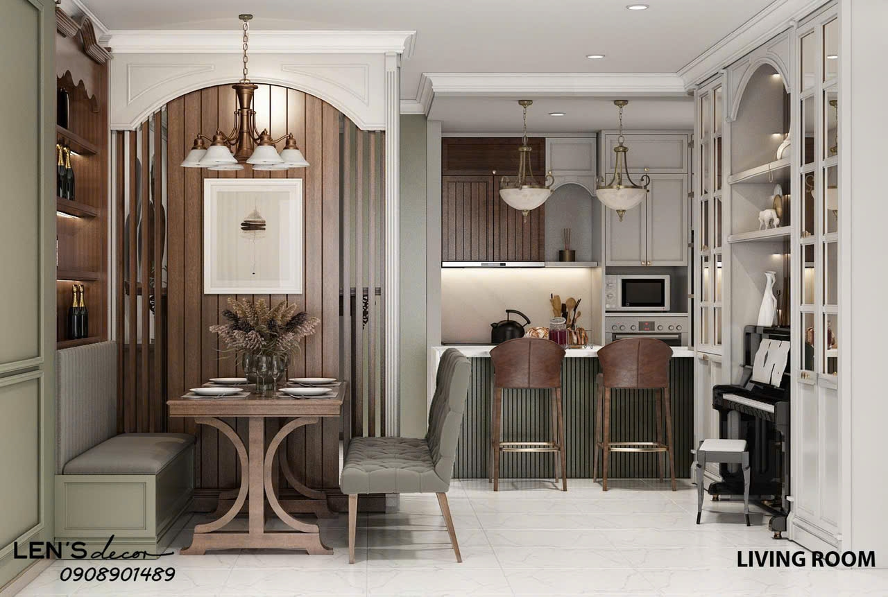 Căn hộ được thiết kế theo phong cách sang trọng, tinh tế với tông màu ấm áp và nội thất mới hoàn toàn. Phòng khách nổi bật với sofa da phong cách cổ điển, kết hợp bàn trà tròn hiện đại, tạo nên điểm nhấn ấn tượng và đẳng cấp. Không gian được bố trí hài hòa, tối ưu ánh sáng tự nhiên nhờ hệ cửa kính lớn, mang lại cảm giác thoáng đãng và dễ chịu.