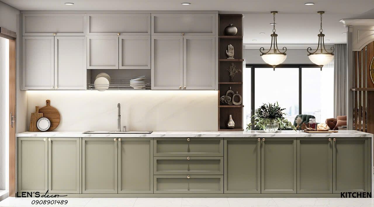 Khu vực bếp và bàn ăn được thiết kế gọn gàng nhưng đầy đủ tiện nghi, trang bị hệ tủ bếp cao cấp, thiết bị bếp hiện đại, đáp ứng nhu cầu sinh hoạt hằng ngày cũng như tiếp đón bạn bè.