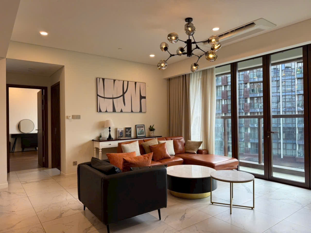 Không gian bên trong được thiết kế hiện đại, sang trọng và đồng bộ. Phòng khách rộng rãi kết nối liền mạch với khu vực bàn ăn, tạo cảm giác mở và thông thoáng. Hệ thống đèn trang trí tinh tế kết hợp cùng nội thất cao cấp giúp tổng thể căn hộ trở nên nổi bật và ấm cúng.