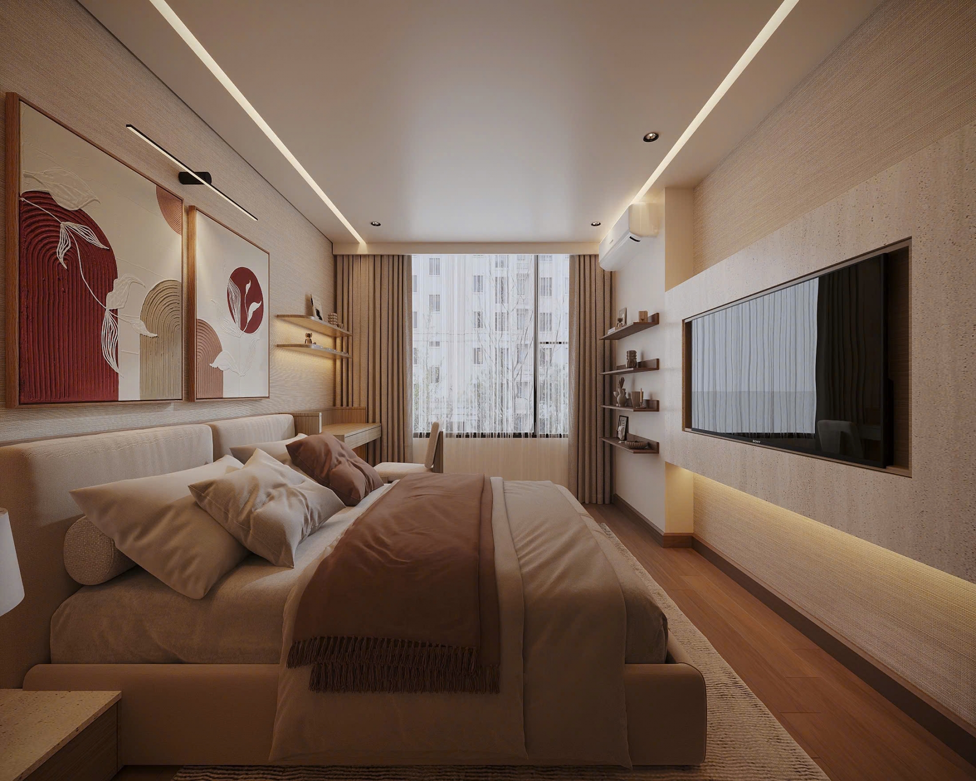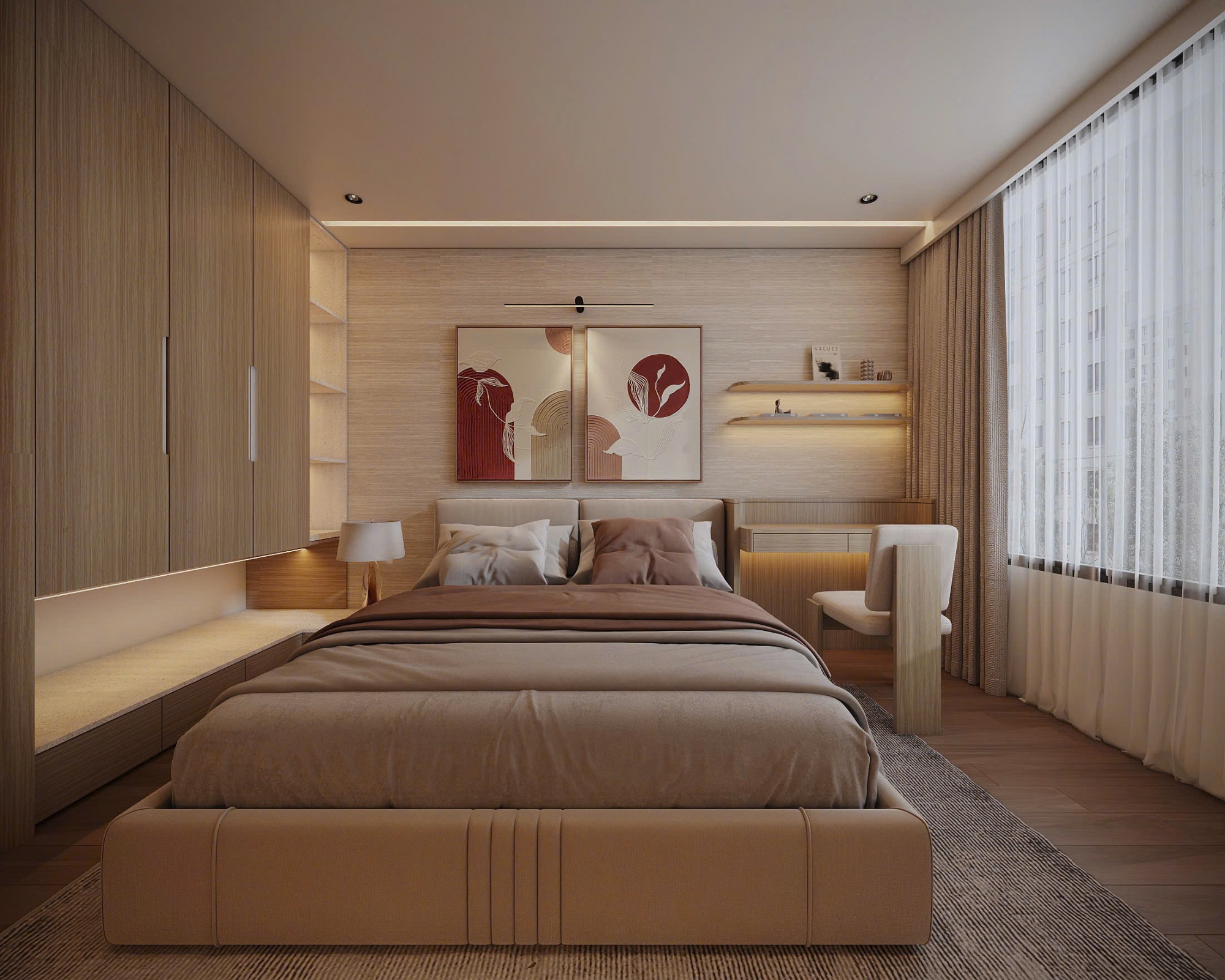 Không gian nội thất được đầu tư hoàn toàn mới, sử dụng vật liệu cao cấp, gam màu trung tính thanh lịch, tạo cảm giác ấm cúng nhưng vẫn rất sang trọng. Phòng khách rộng rãi, kết nối hài hòa với khu vực bếp và bàn ăn, mang đến sự thông thoáng và tiện nghi trong sinh hoạt hằng ngày. Hệ cửa kính lớn giúp căn hộ luôn tràn ngập ánh sáng tự nhiên.