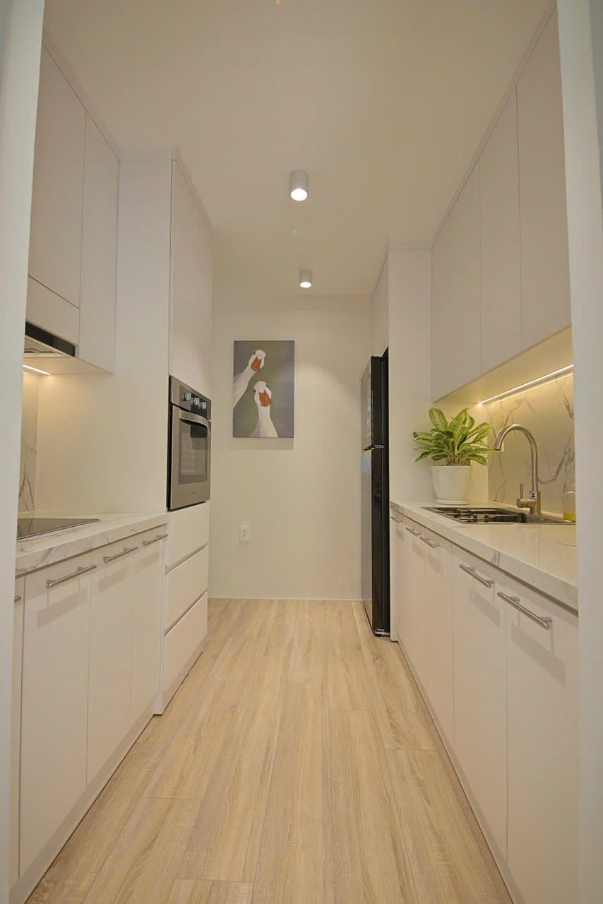 Khu bếp được bố trí gọn gàng, trang bị đầy đủ thiết bị cao cấp, hệ tủ bếp hiện đại, tối ưu công năng sử dụng. Ba phòng ngủ có diện tích rộng, nội thất đồng bộ, giường tủ chất lượng cao, đảm bảo sự riêng tư và thoải mái cho từng thành viên trong gia đình. Hai phòng vệ sinh được hoàn thiện bằng vật liệu tốt, sạch sẽ và tiện nghi.