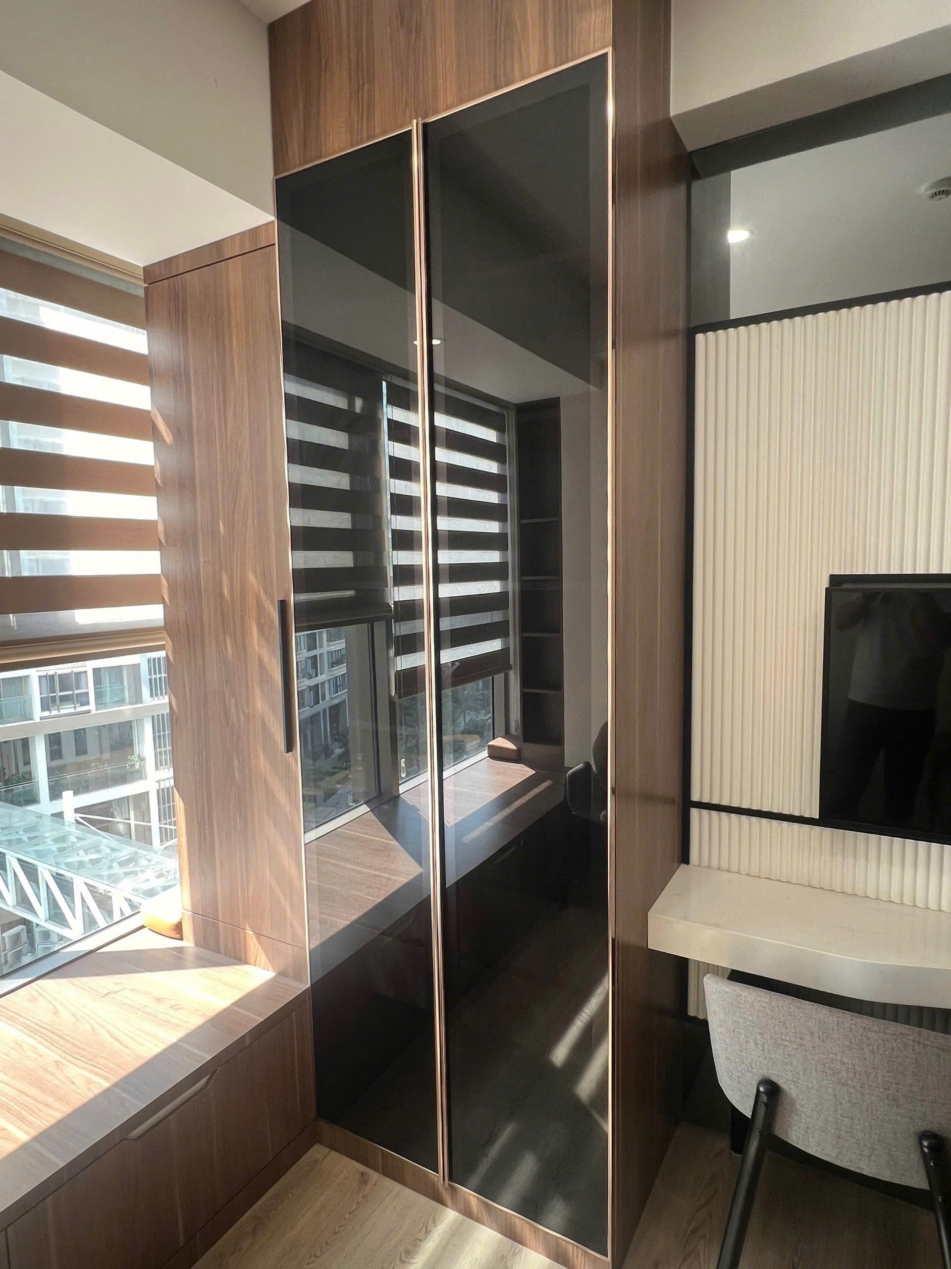 Ban công rộng với cửa kính lớn giúp căn hộ luôn tràn ngập ánh sáng tự nhiên, đồng thời đón gió mát, mang lại không gian sống thoải mái và dễ chịu. Khu vực bếp và bàn ăn được bố trí gọn gàng, đầy đủ thiết bị, phù hợp cho gia đình nhỏ hoặc chuyên gia sinh sống lâu dài.
