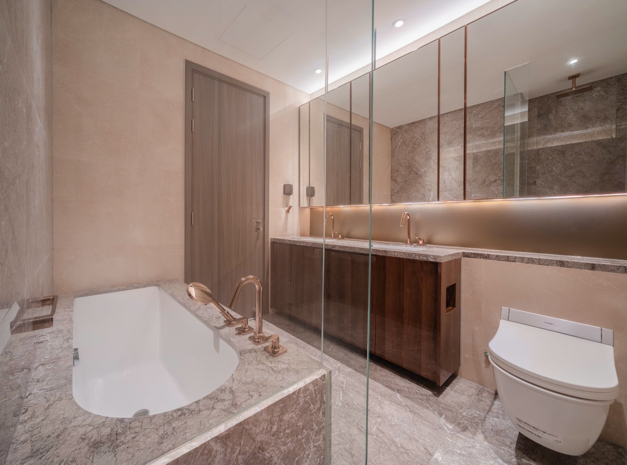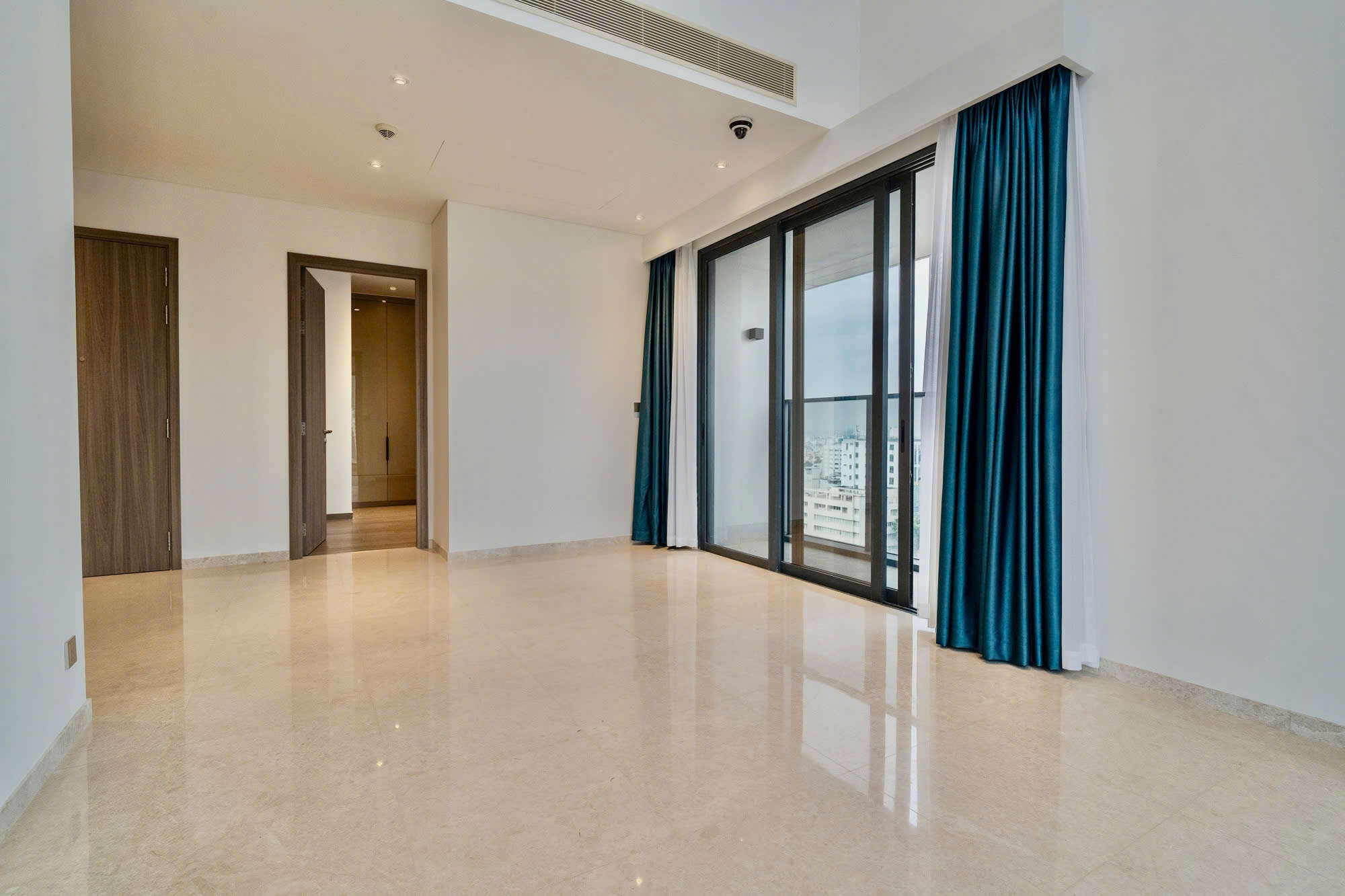 Căn hộ thiết kế 4 phòng ngủ với diện tích rộng, bố cục khoa học, phù hợp cho gia đình đông thành viên hoặc chuyên gia nước ngoài cần không gian sinh hoạt và làm việc thoải mái. Phòng khách nổi bật với hệ cửa kính lớn kịch trần, đón ánh sáng tự nhiên tối đa và mở ra tầm nhìn thành phố rộng mở.