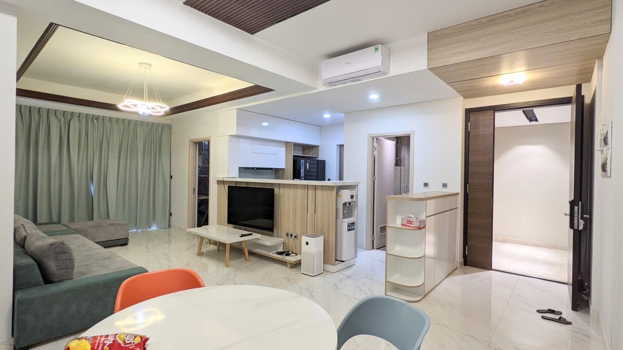 The unit has 110 sqm and features three bedrooms and two bathrooms with a well-designed layout. The spacious living room connects to the kitchen and dining area, creating a comfortable living space. The apartment is fully furnished in a modern style, ready for move-in or rental investment.