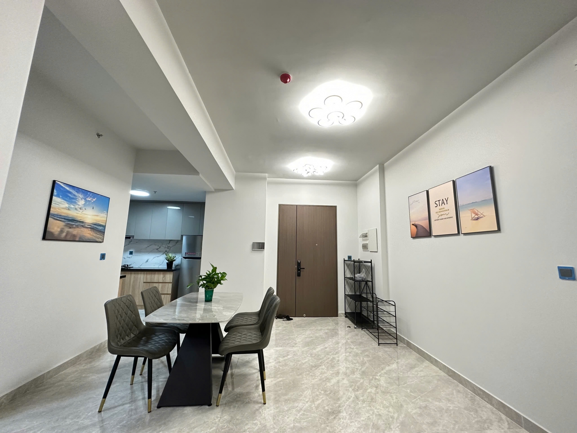 The apartment comes with high end furniture and modern interior design. The living room includes a comfortable sofa, TV cabinet, and elegant lighting. Large glass doors lead to the balcony, allowing plenty of natural light to enter the apartment and making the space feel open and airy.